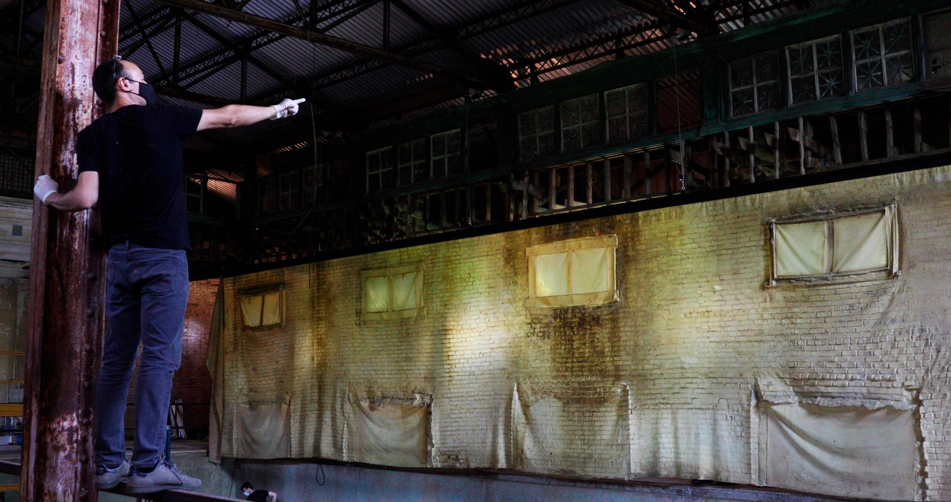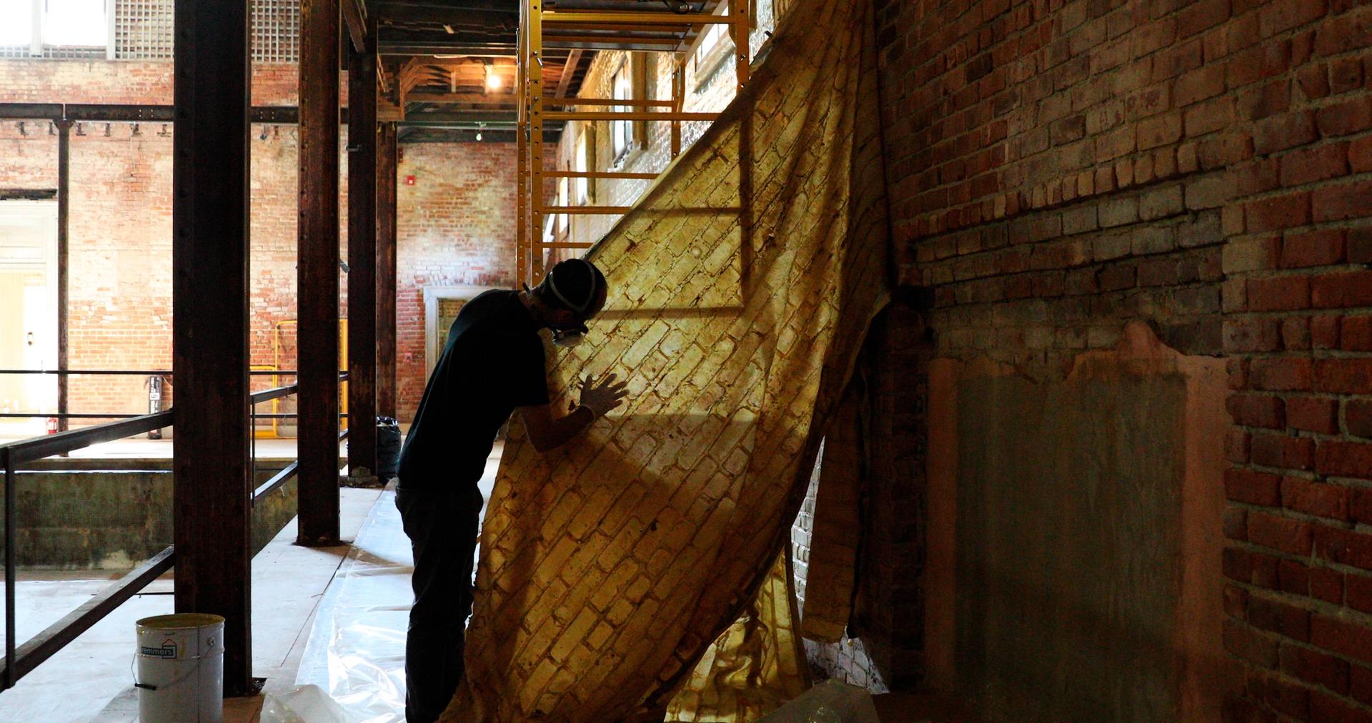 Jorge Otero-Pailos installing Watershed Moment in the historic pool building of Lyndhurst Mansion Photo: Courtesy of Gina Levay for Lyndhurst, a site of the National Trust for Historic Preservation, Sapar Contemporary and the artist