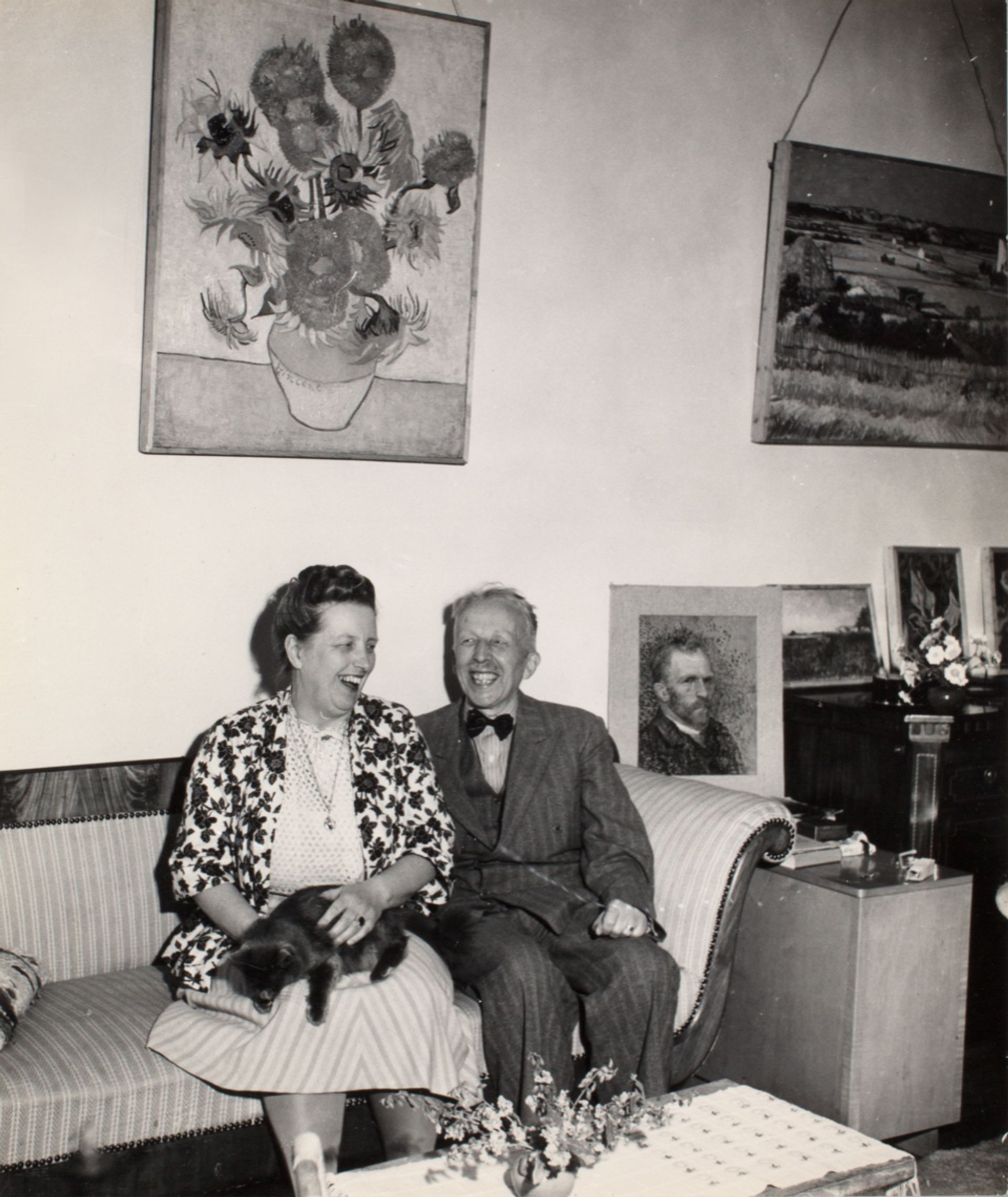 By 1949, Vincent Willem and his wife Nelly had hung the Sunflowers (August 1888) above their sofa, with The Harvest next to it. Both paintings were given modest narrow frames and casually hung on long strings. Beside them is a self-portrait (1887), perilously close to the cat on Nelly’s lap.
