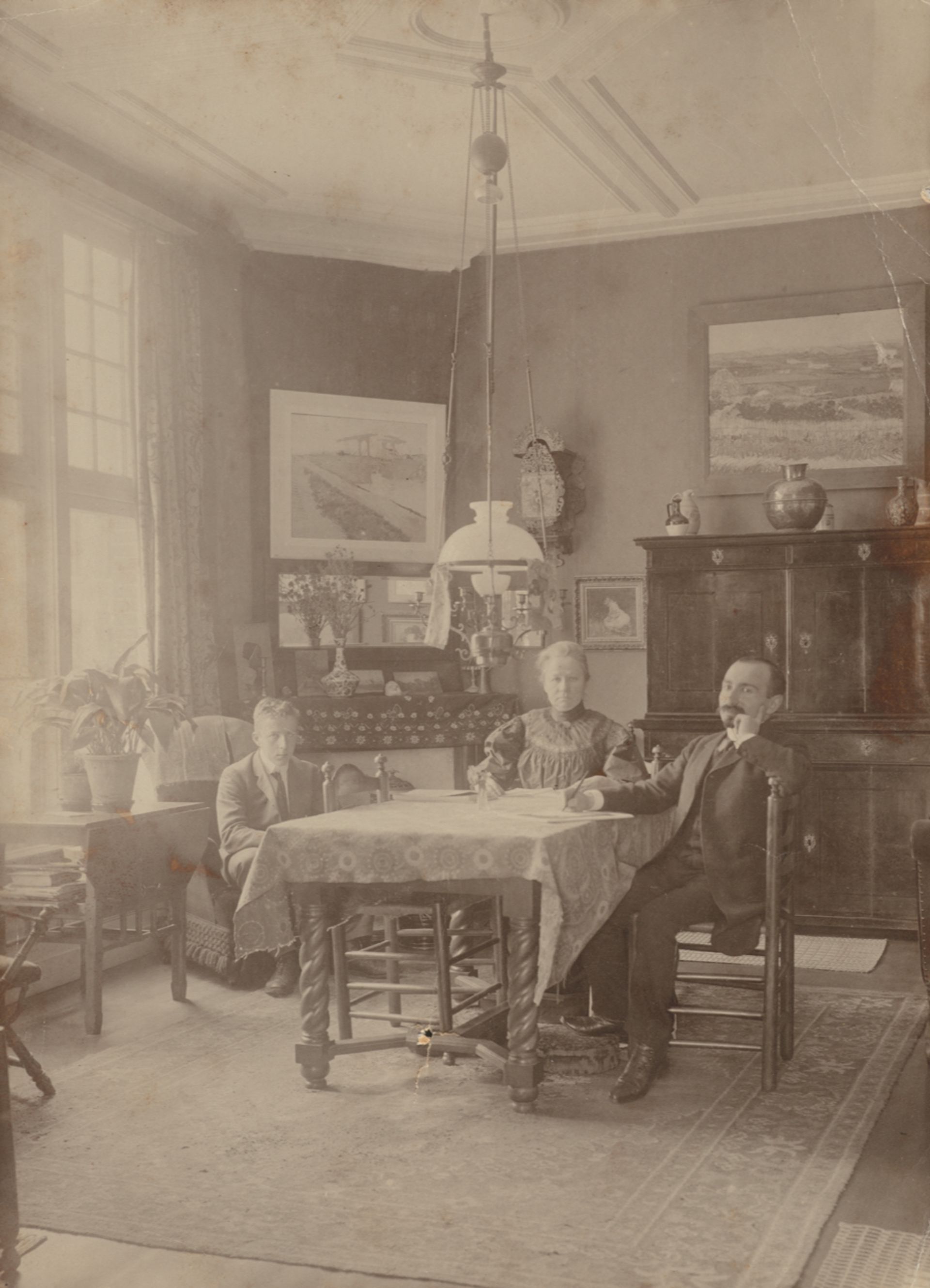 Salon with Vincent Willem, Jo Bonger and Johan Cohen Gosschalk in their Amsterdam apartment, with The Harvest above a chest (1910-11) Photo: Bernard Eilers. Courtesy of the Van Gogh Museum, Amsterdam (Vincent van Gogh Foundation)