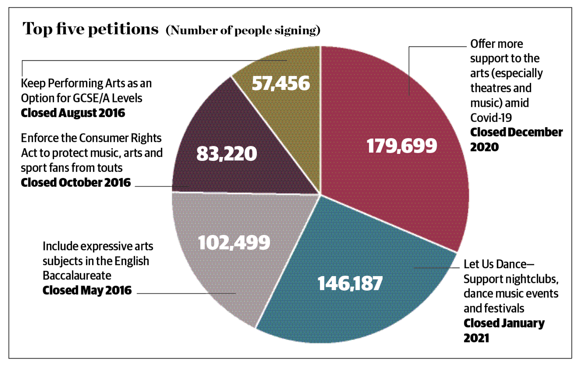 The e-petitions making it into parliamentary debate were dominated by the pandemic, including a recent petition to provide support to the arts (particularly theatres and music) amid the Covid-19 outbreak and another to support music events and festivals. In these cases, the government reiterated its support packages for the sector already announced, and made no policy changes. The third petition to reach the threshold was a 2016 outcry over the exclusion of the arts in the English Baccalaureate scheme.