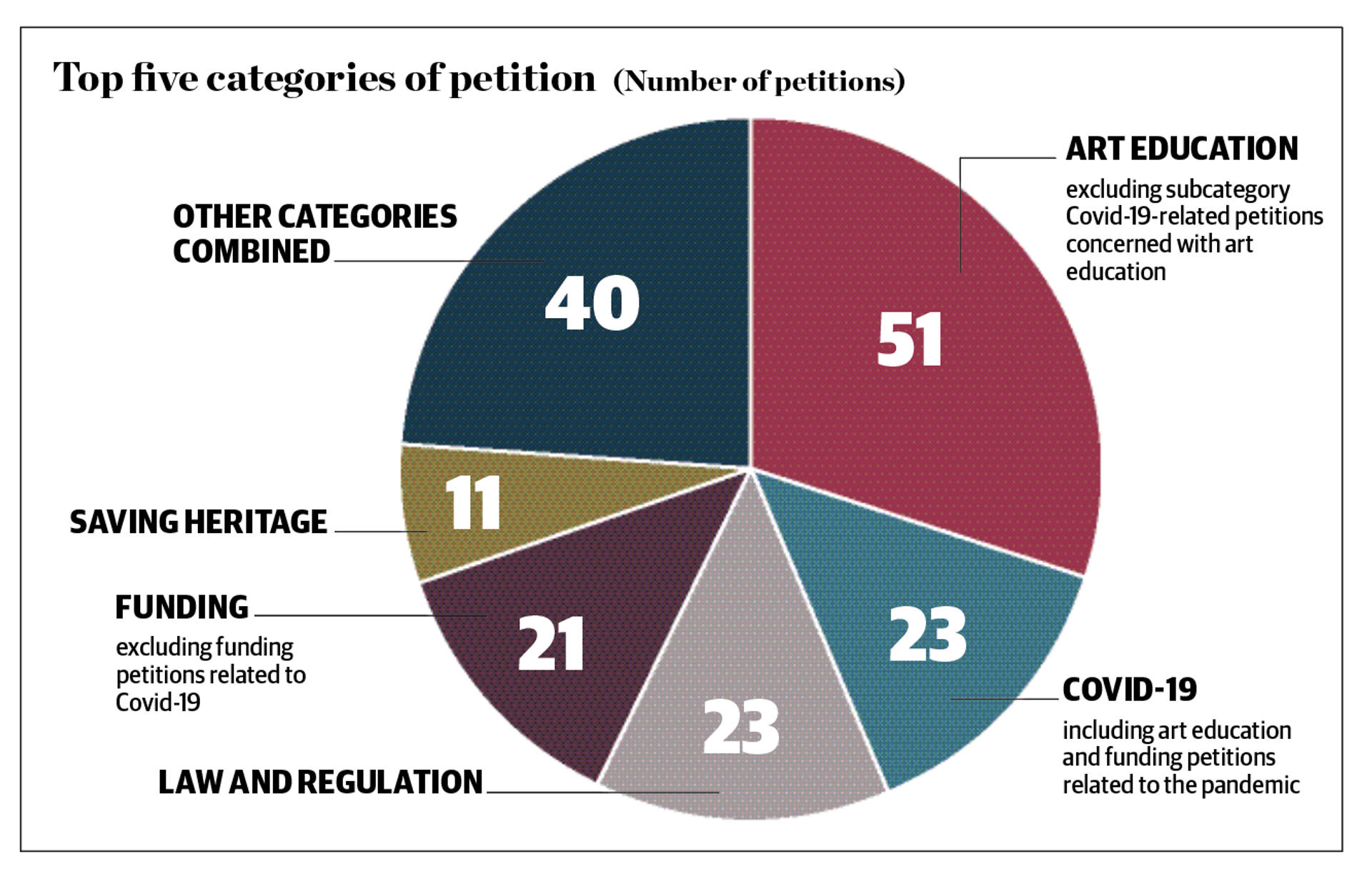 So, what has been riling the art-loving public? Seemingly, education—or, rather, the lack of importance given to it. Around a third of arts-related petitions were concerned with the issue, with many stressing the importance of keeping a range of creative subjects within the core curriculum and others calling for greater financial support for students undertaking creative subjects.