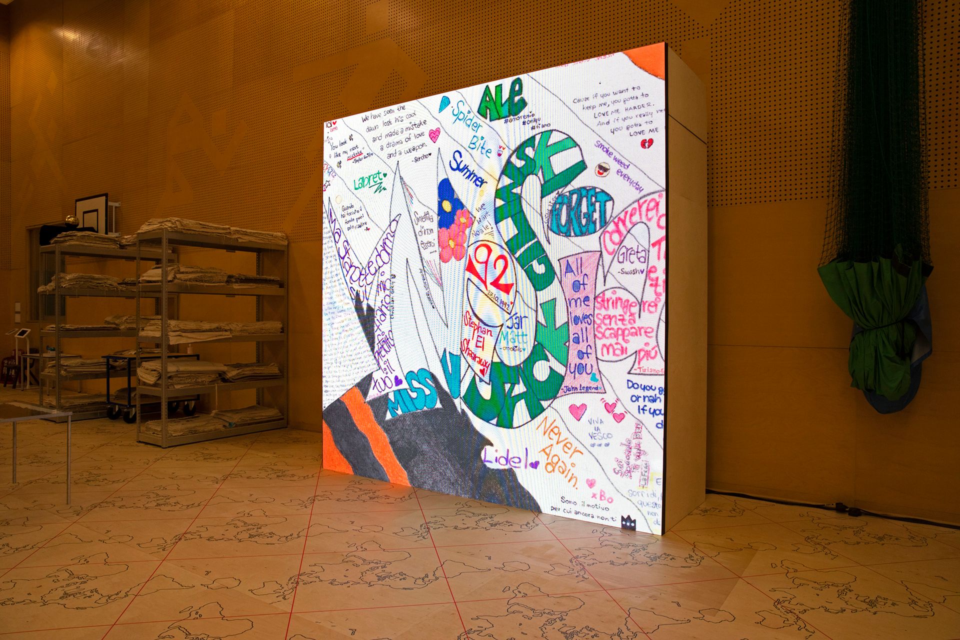 At the heart of his work is an engagement with language, with the nature of labour and production, with the movement of people and with fluid cultural identities. In this interview he discusses his major project Frequencies, in which children from more than 350 schools in 34 countries across the world were sent canvases that were affixed to desks, so that children could draw and write on them, consciously or unconsciously, over several months—and how the project relates to his own work.