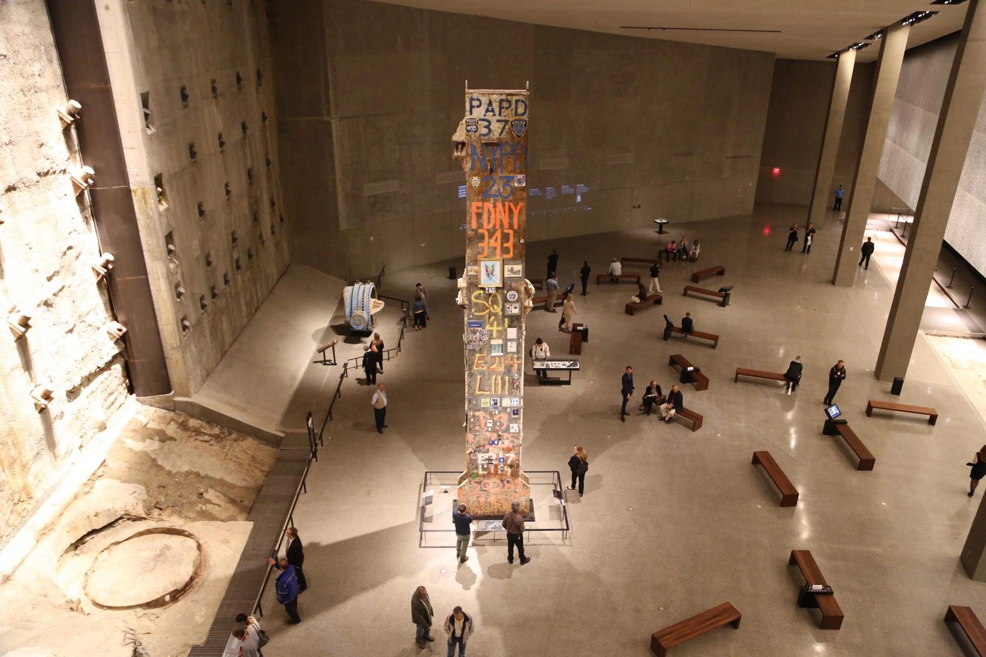 The atrium of the National September 11 Memorial and Museum, with the Last Column, a steel beam from the buildings that was marked by first responders and recovery crews