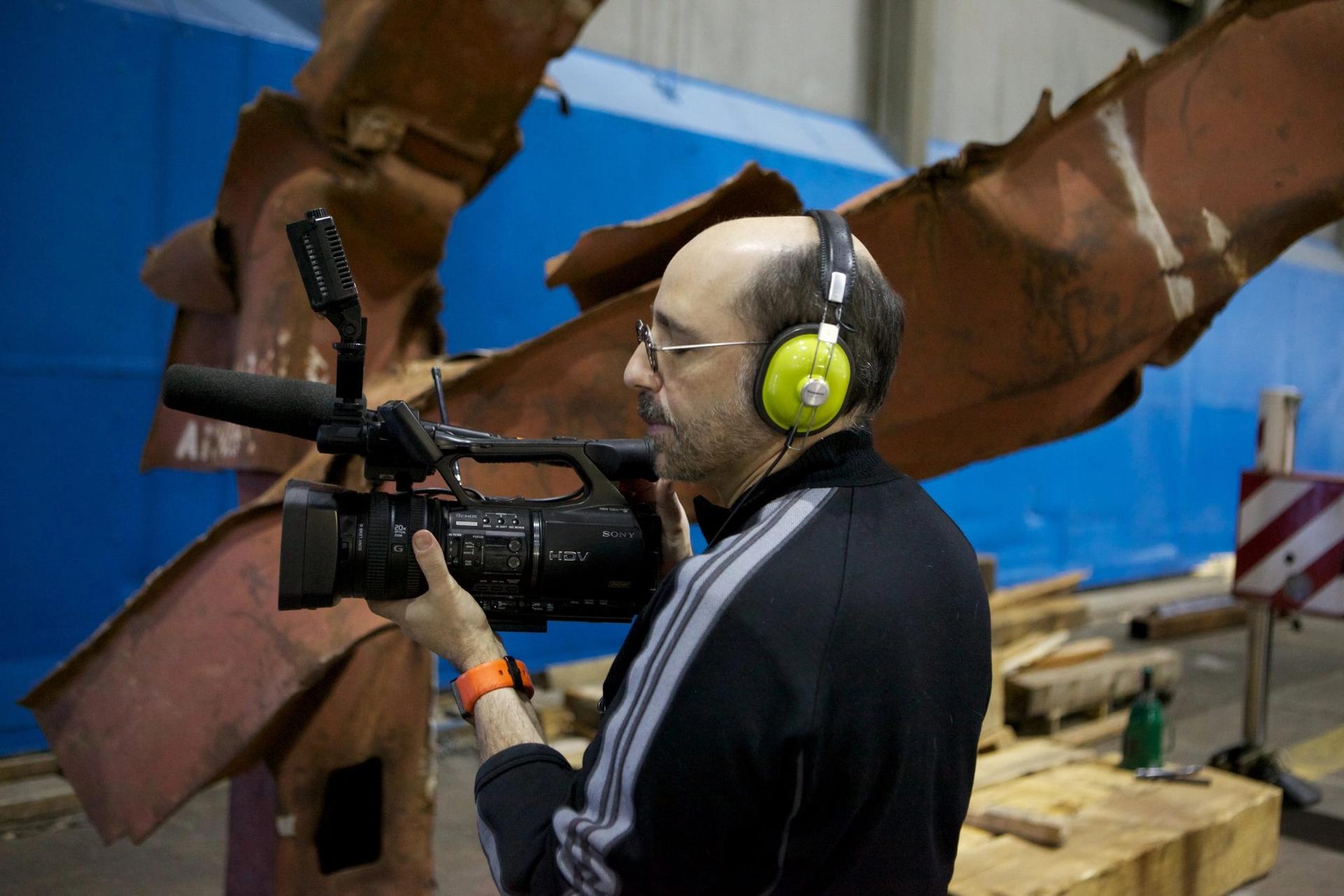 The film-maker Steve Rosenberg shooting as the museum was under construction, with one of the bent trusses from the destroyed Twin Towers behind him