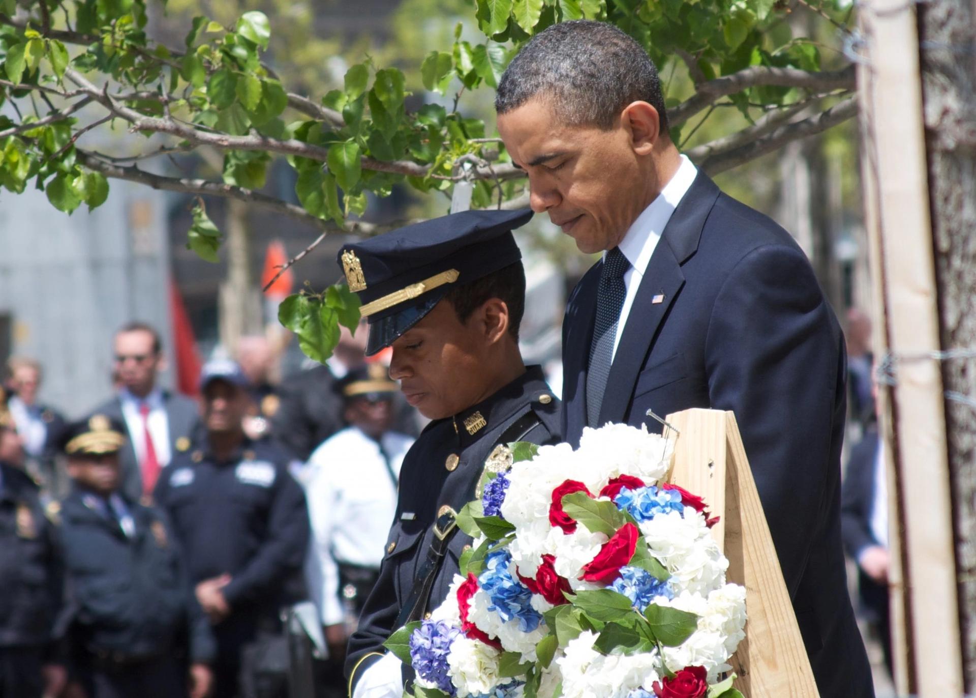 President Barack Obama prepares to lay a wreath at the Ground Zero site during his visit to the memorial and museum