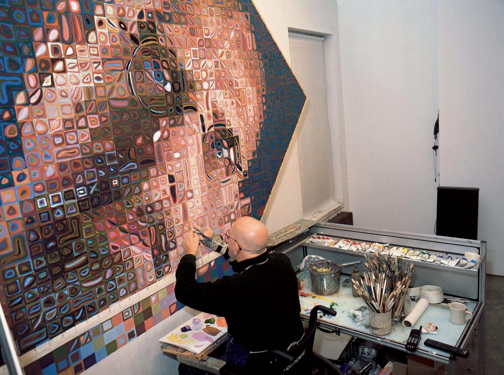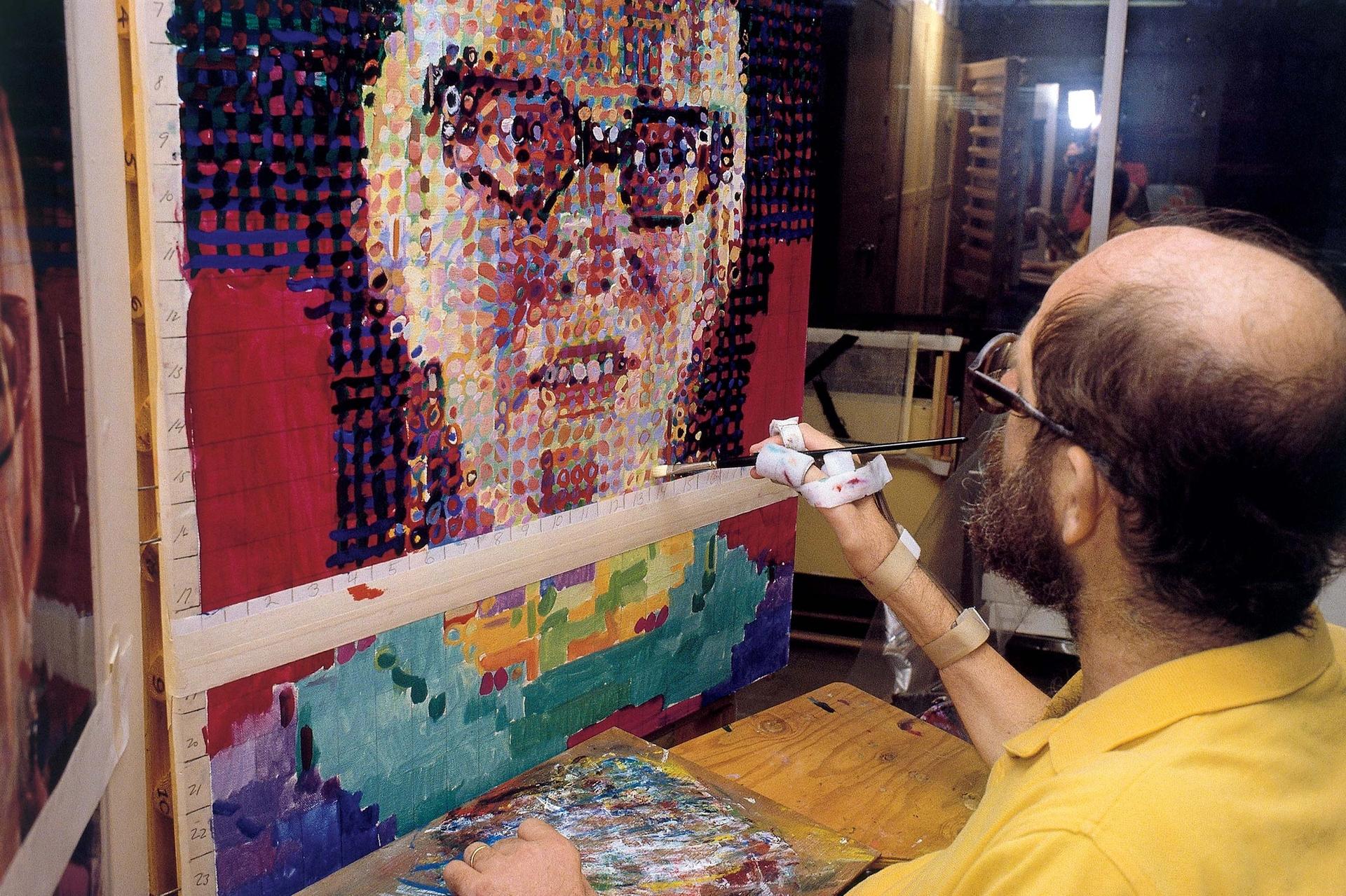 Chuck Close working on Janet (1989) with a paintbrush strapped to his arm