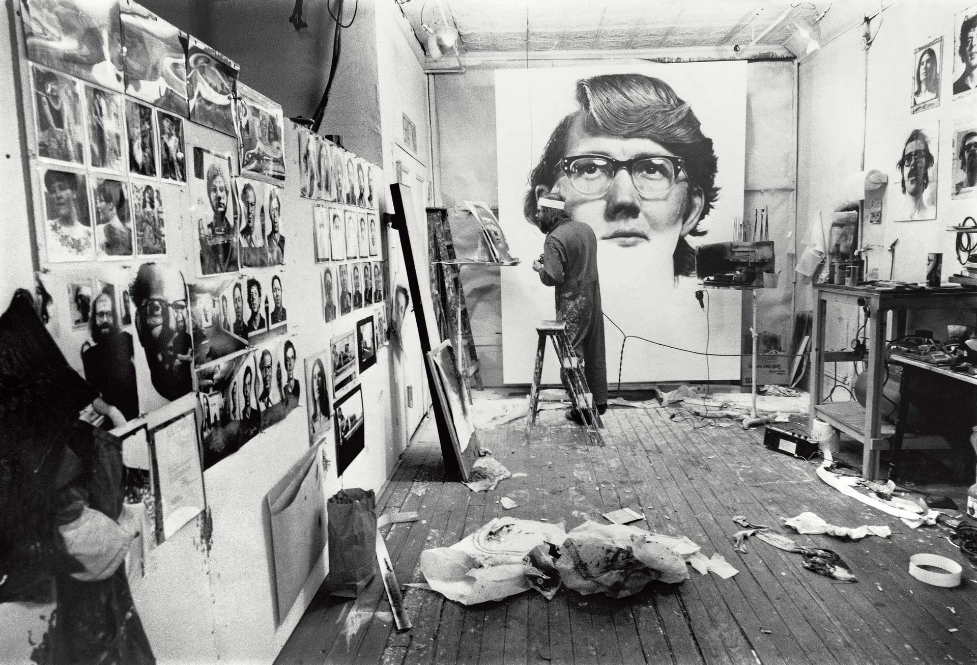Chuck Close working on the portrait Keith (1970) in his New York studio