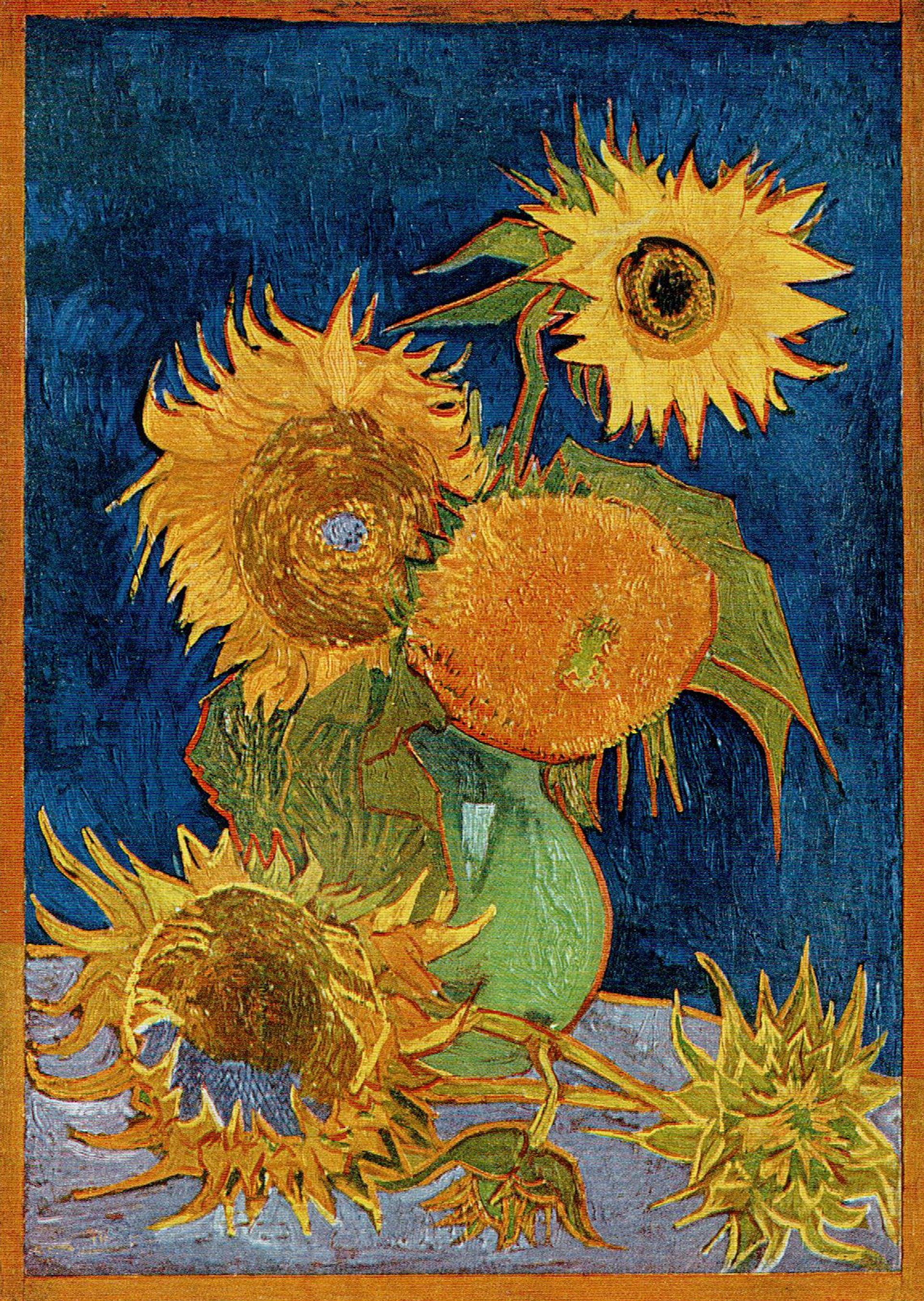 I then went back to Van Gogh’s letters. Immediately after completing Six Sunflowers he had written to his fellow artist Emile Bernard: the yellows of the flowers would ”burst” against the blue background, “framed with thin laths painted in orange lead” (orange lead is a bright yellow-orange pigment). The effect, he said, would be of “stained-glass windows of a Gothic church”.