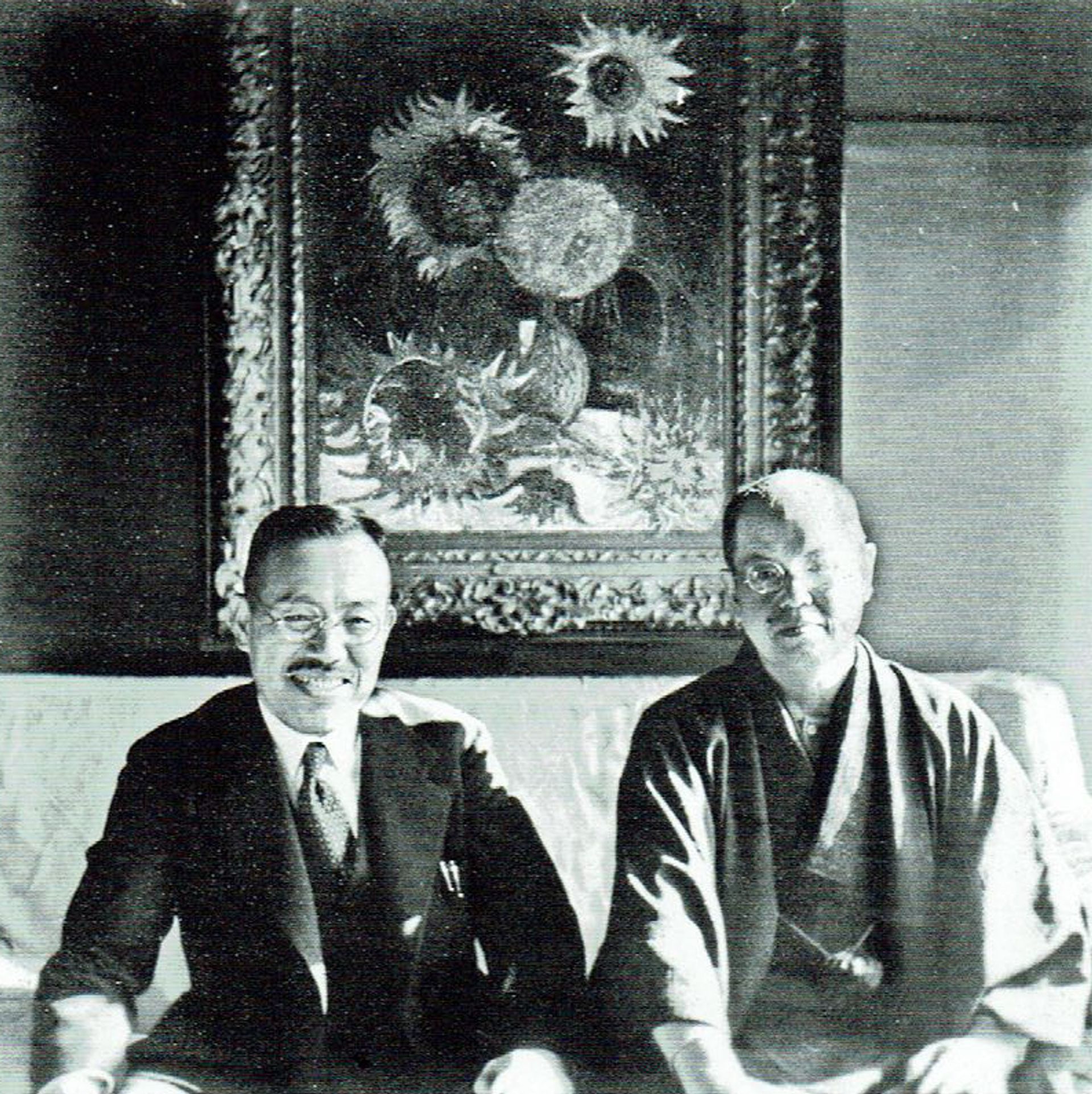 Koyata Yamamoto (left), with the writer Saneatsu Mushakoji, in his Ashiya home, 1938 Courtesy of Mushakoji Saneatsu Memorial Museum, Chofu, Tokyo