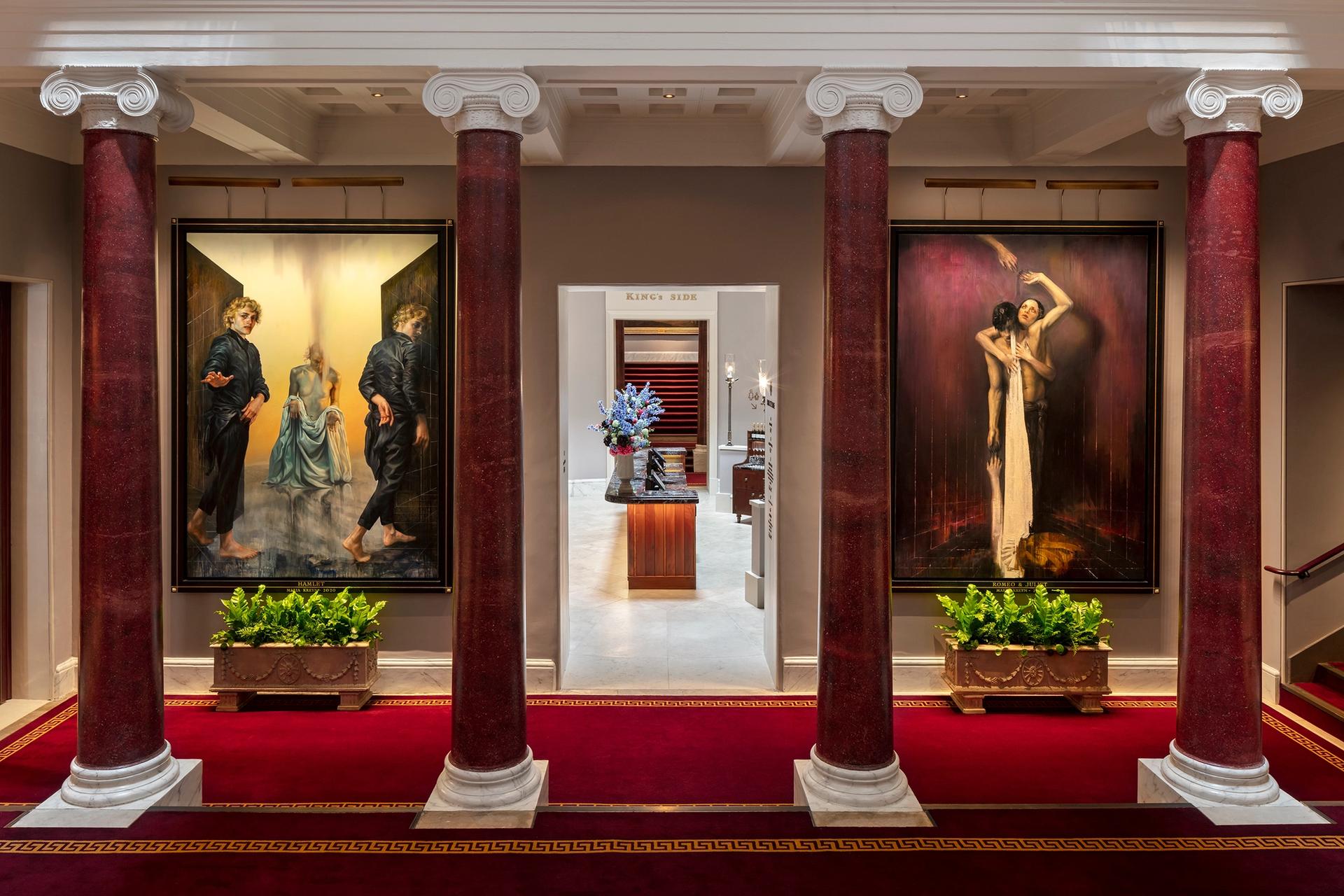 The Wyatt Staircase Corridor at Theatre Royal Drury Lane, featuring Hamlet and Romeo & Juliet , both by Maria Kreyn (2021) Courtesy of TM Lighting and Andrew Beasley Photography