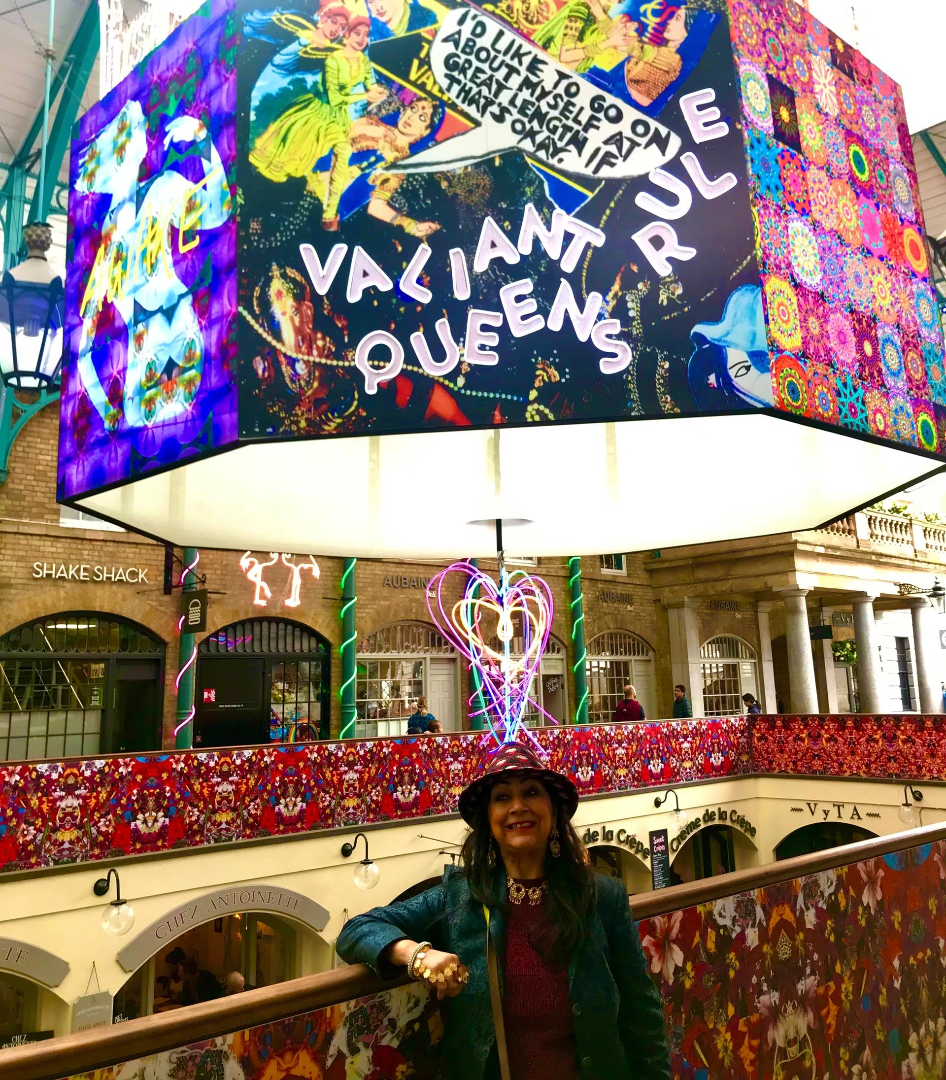 In acknowledgement of all the surrounding retail signage, Burman has increased the amount of text, both printed and illuminated, in her work. "Do you see words in rainbows?" written in purple neon welcomes visitors to the South Hall, while "Punjabi Rocker", "Carnival of Feminists", and "Valiant Queens Rule" are among the messages blended into Burman’s visual smorgasbord.