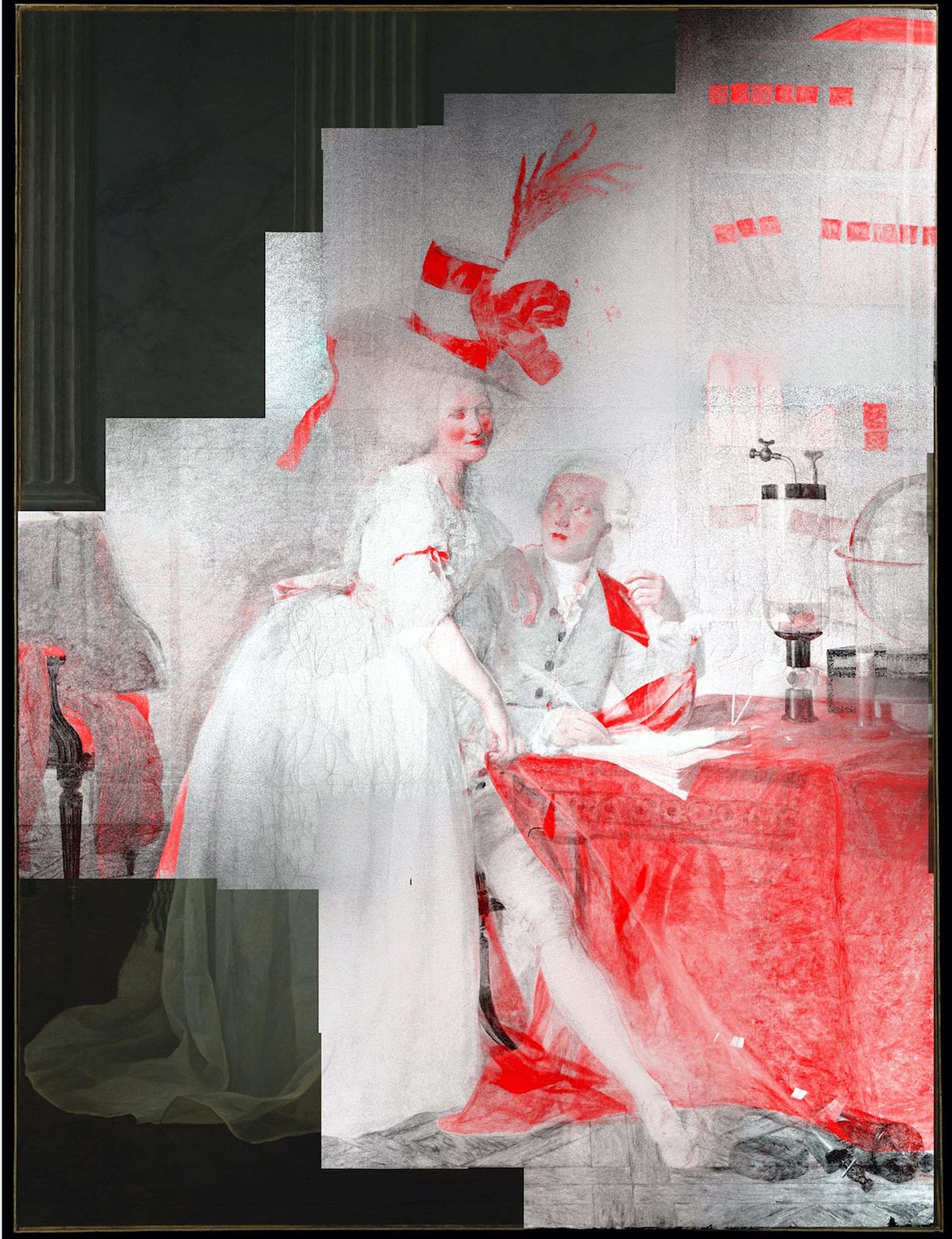 A drawing produced with tracing information obtained through infrared reflectography and macro X-ray fluorescence. It reflects Jacques-Louis David's original rendering of Antoine Laurent and Marie-Anne Lavoisier in a 1788 portrait. Department of Paintings Conservation, Metropolitan Museum of Art, New York. Originally published by The Burlington Magazine