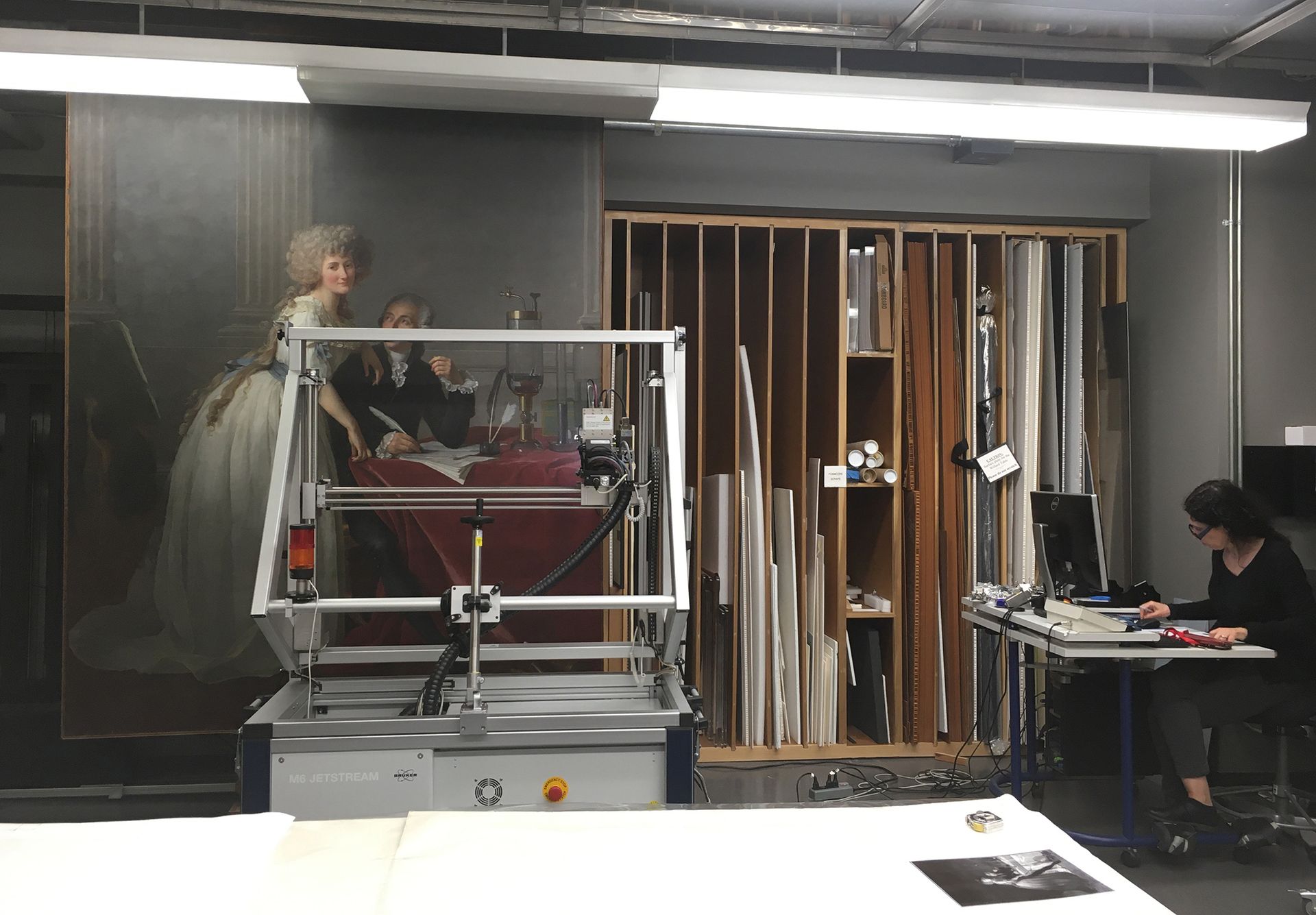 Silvia Centeno, at right, generating X-ray fluorescence maps of Jacques-Louis David's portrait of the Lavoisiers Dorothy Mahon, 2019