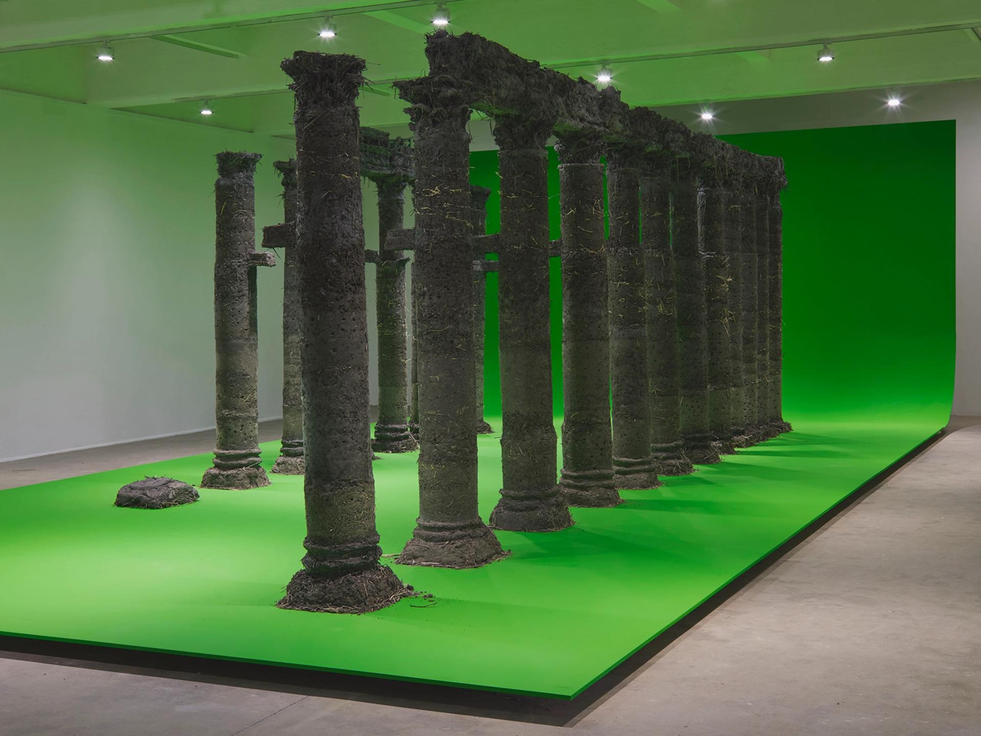 In a room filled with the sound of a low pulsing hum, a tall, dark brown colonnade stands in partial ruin, placed upon a green screen. Upon closer inspection, the pillars appear to be made from straw and tightly packed mud. It seems as though a film crew is just out of sight. The more archaeologically informed might quickly recognise that this structure closely resembles a two-millennia-old arch in Palmyra that was destroyed by Isis in 2015 (the exhibition’s text informs us of as much too). One might also recall its well-documented quasi-reconstruction: a 3D facsimile of the arch, two-thirds the size of the original, was created by a team of scientists at Oxford University and unveiled in London by Boris Johnson in 2016. Termed a "show of solidarity", it invited and eluded in equal measure the debate around the historic power structures that led to the monument's very ruination. With Abbas Akhavan's show eerily timed with the fall of Kabul to the Taliban, this dense, poetic work reminds us that the destruction of cultural heritage is as cyclical as it is tragic.