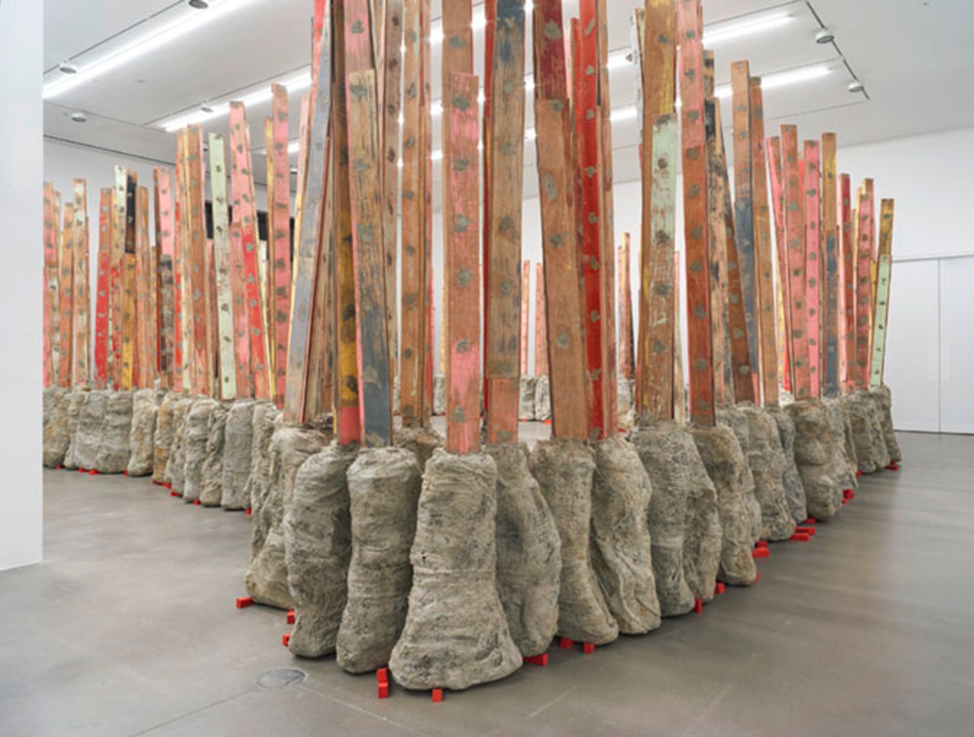 The centrepiece of Phyllida Barlow's new London exhibition, a towering 2014 sculpture untitled:postcorral, dominates Hauser and Wirth's vast North Gallery, but in a characteristically un-monumental fashion. It consists of crudely painted triangular wooden poles weighted down by lumpen cement bases, closely arranged in a lopsided circle that reaches almost to the room's edges. In Barlow's typical style, the work forces you to navigate the space awkwardly, skirting around the narrow gap between the sculpture's perimeter and the gallery's walls, all while peering in to the large open space you are denied access to. Forced to experience something so big up-close leaves one feeling less awestruck than mildly inconvenienced, revealing the surprisingly absurd and tender reactions that a 20-ft-high sculpture can elicit. A series of 12 brightly coloured drawings—slightly too abstract to term preliminary studies for the sculpture—hang in a neighbouring room, indicative of the playful curiosity that best defines Barlow's long, prolific career.