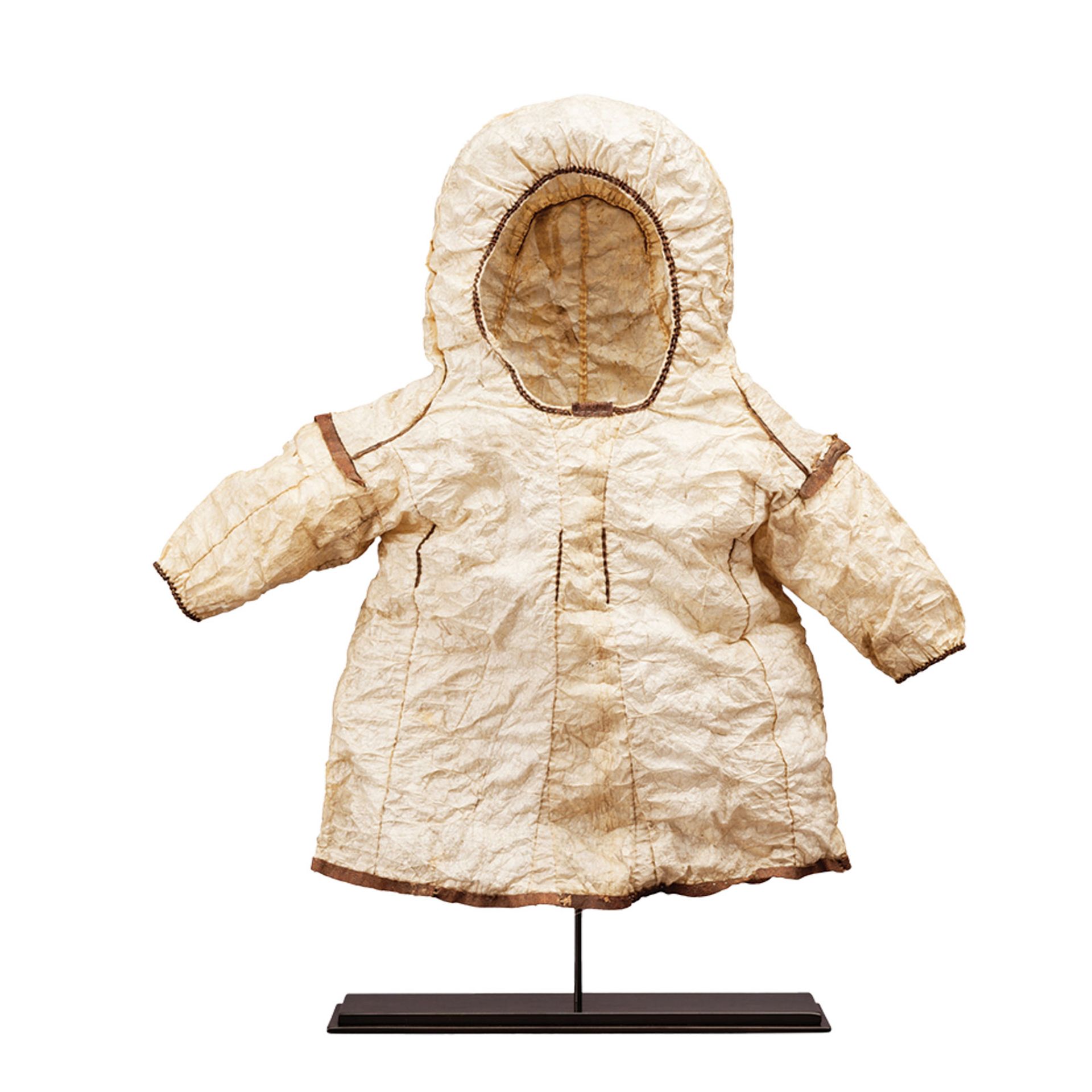 Not one for the squeamish, this 40cm-high waterproof parka was made for an Inuit child from pieces of seal guts finely stitched together with sinew thread. Such coats made from this lightweight, durable material were admired by Admiral Lord Nelson and Captain Cook—the latter even purchased them in large numbers for his crew. But they were also believed to have symbolic and protective powers—safeguarding the wearer against evil and bringing good luck—and were worn by shamans during rituals. Seals are a central part of Inuit culture, the hunting of them crucial to keeping its people alive and warm in harsh conditions. These parkas would have been worn during the mid-winter celebration of the soul of the seals and at the start of the spring seal season. Similar, adult-sized examples are held in the collection of the British Museum.