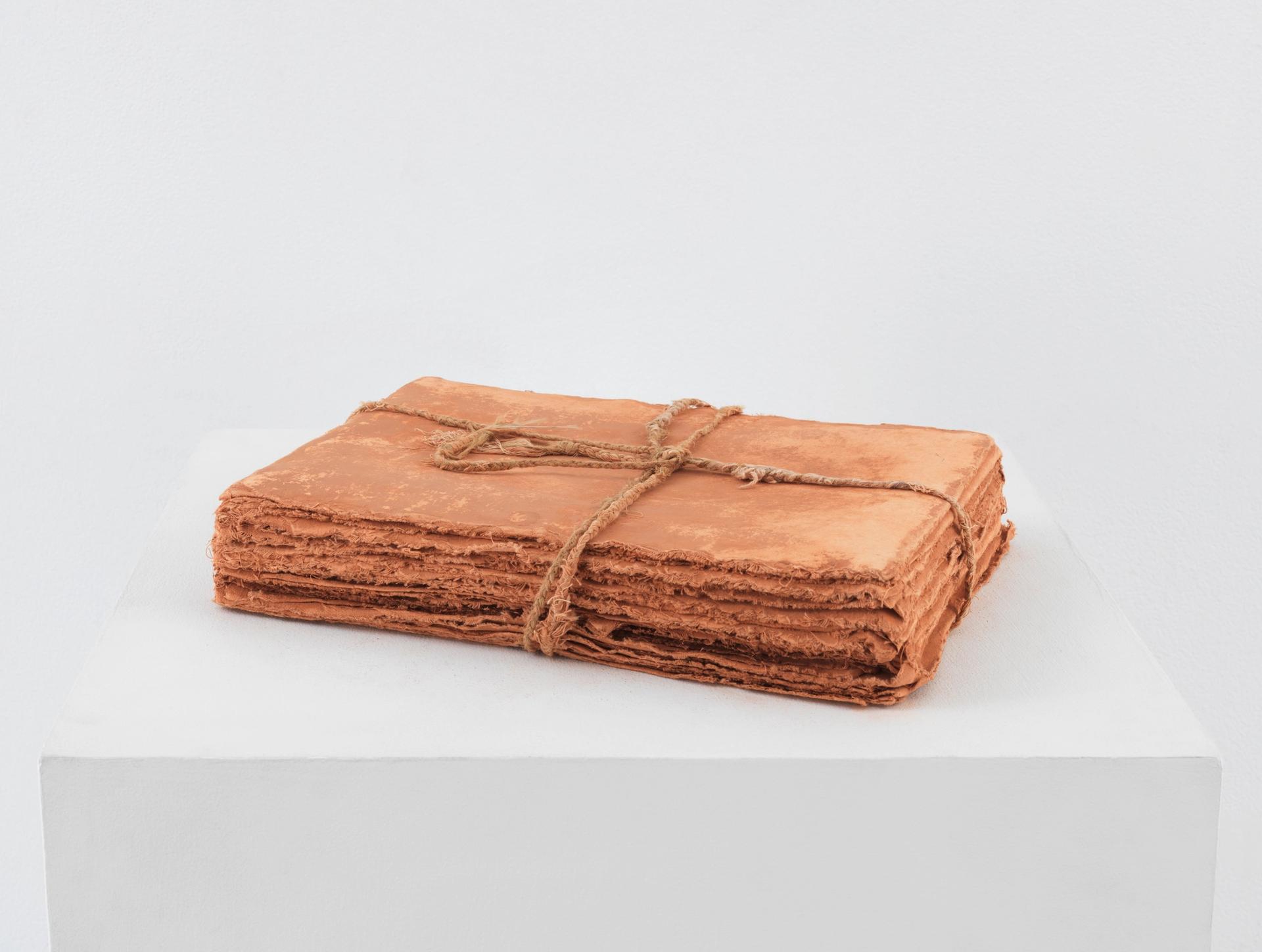This book was made using earth from New Mexico that I collected in the 1970s, while I was visiting early Indigenous and Spaniard sites. I’m interested in archaeology and read about an archeologist who travelled to the Himalayas and described visiting a cave that was full of Buddhist books and scrolls. I imagined these books disintegrating in the cave, and how the text must be gone but the books are still there. I made volumes of pages without text on them and bound the books closed. These are books of secrets.
