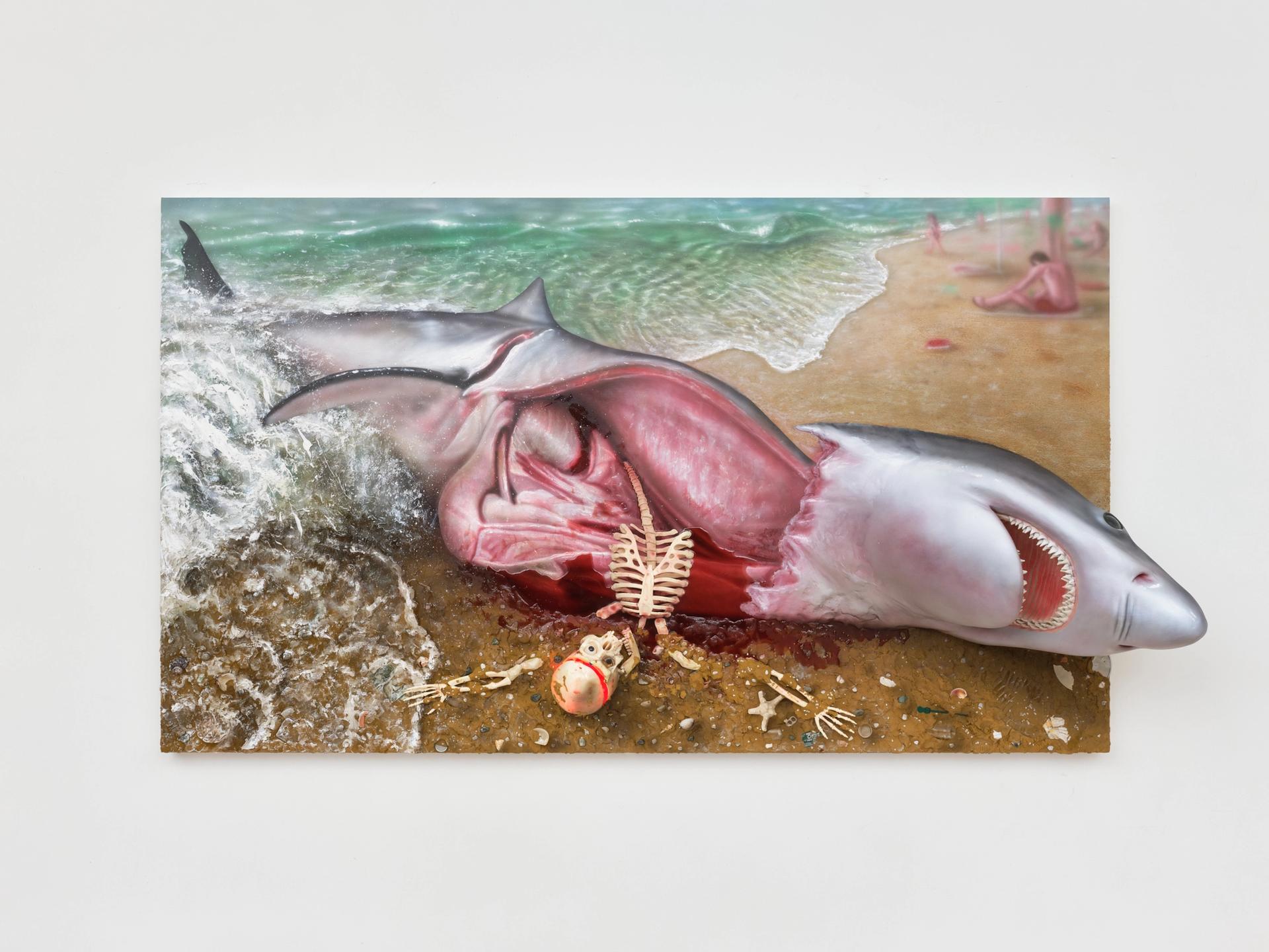 Upstairs, where galleries tend to be younger with art at lower price points, the Berlin dealer Johann König was also notching up sales at a rapid clip yesterday. The gallery was busy negotiating with buyers for a Katharina Grosse painting priced at €310,000 and for Trey Abdella’s lurid relief of a shark (a Halloween mask) and a skeleton for €45,000. König had even sold a Claudia Comte work, Morphing Sculpture (The Mountain), priced at €120,000, at a dinner the night before the fair opened.