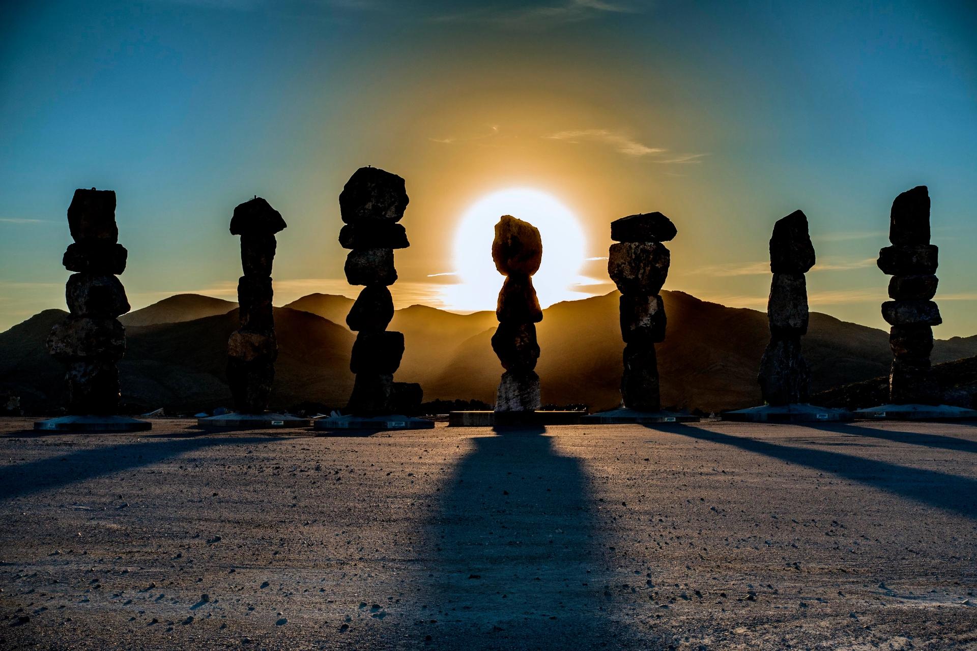Gianfranco Gorgoni, Ugo Rondinone’s Seven Magic Mountains, near Jean Dry Lake, Nevada, 2016 (2016) © Estate of Gianfranco Gorgoni; Artwork co-produced and presented by the Nevada Museum of Art and Art Production Fund; Artwork © Ugo Rondinone