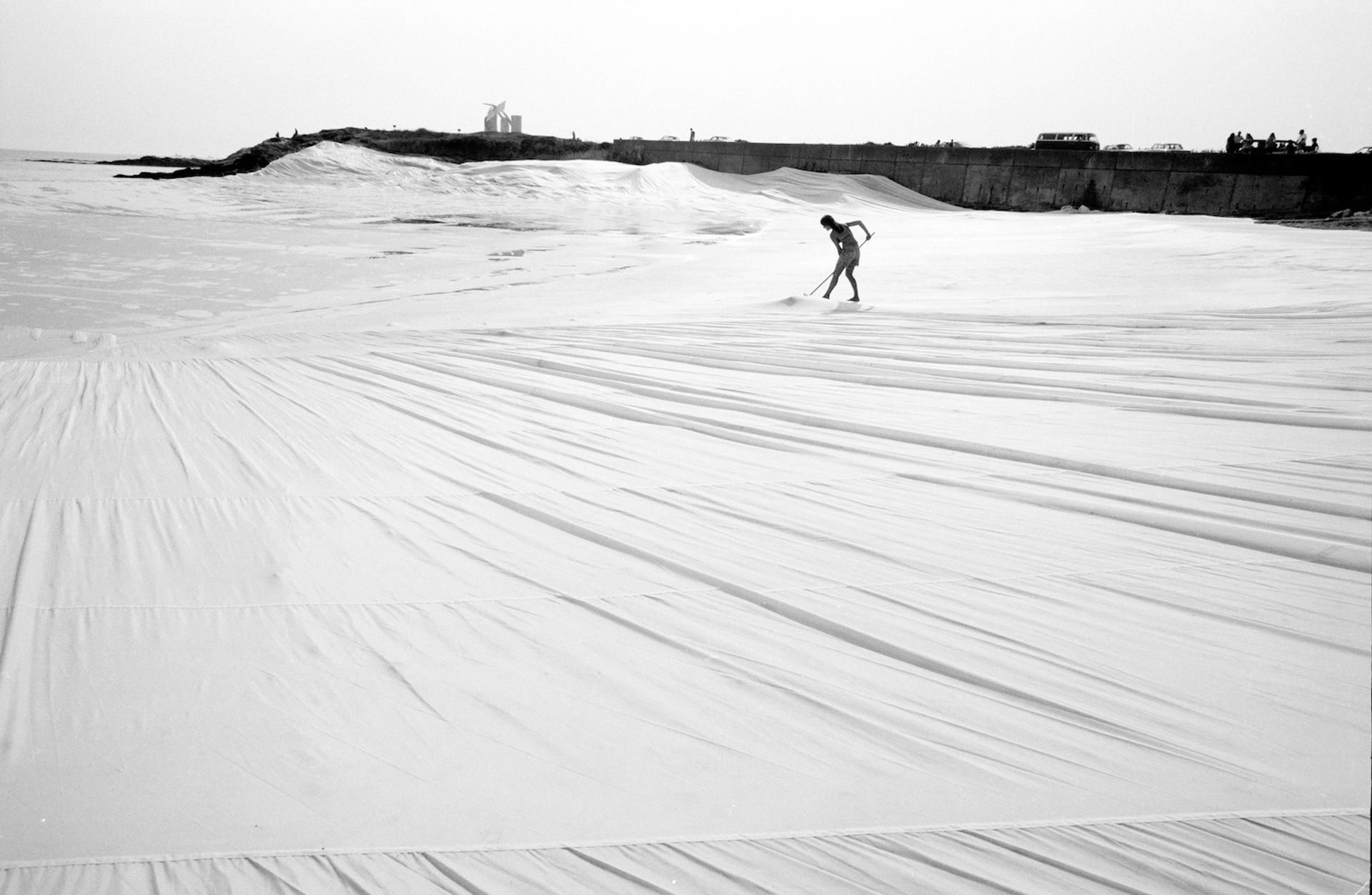 Gianfranco Gorgoni, Installation of Christo and Jeanne-Claude’s Ocean Front, Newport, Rhode Island, 1974 (1974) © Estate of Gianfranco Gorgoni; Artwork © Christo