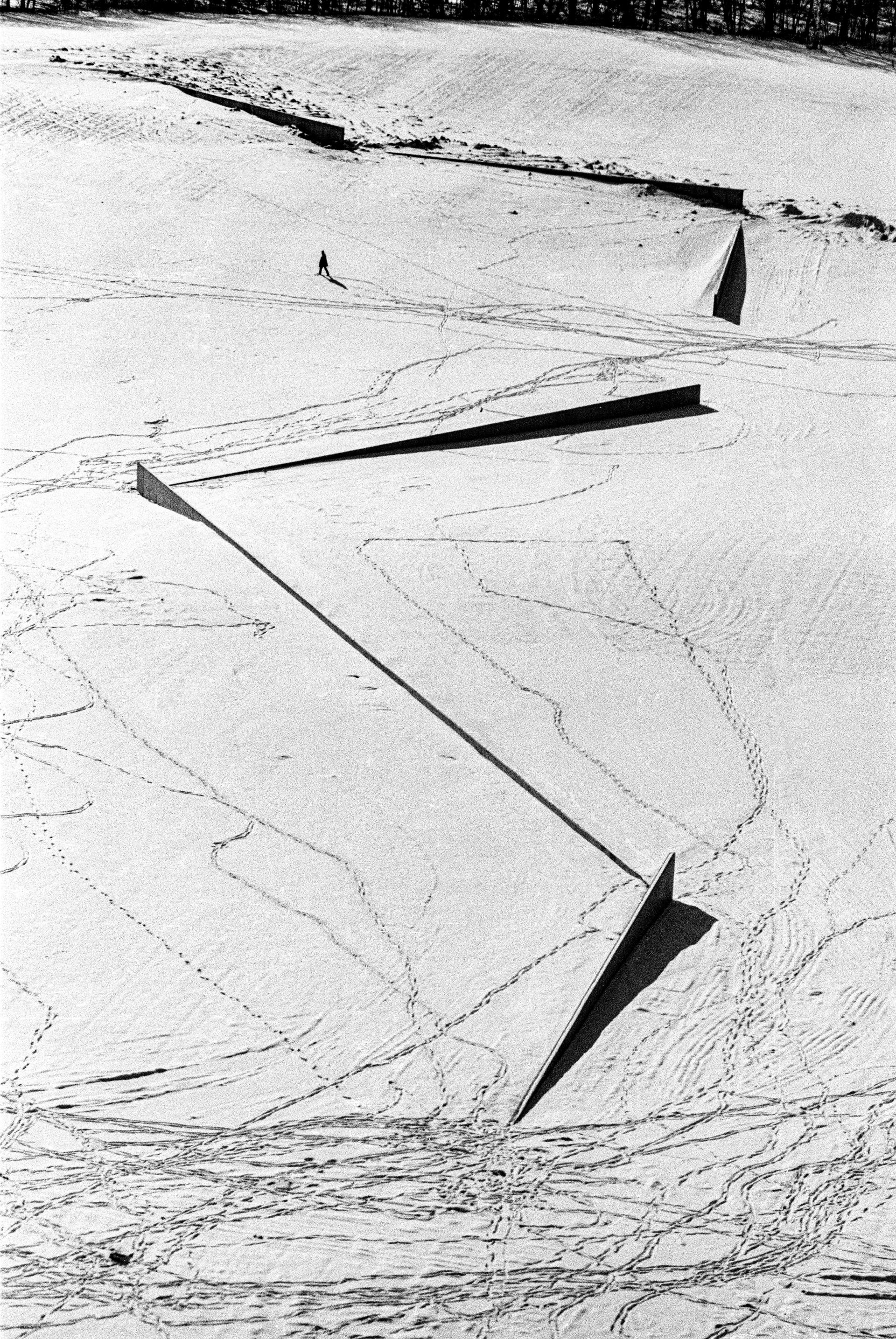Gorgoni captured various works that are now threatened by encroaching development or neglect, like Heizer’s Double Negative (1969) in the Nevada desert and Serra’s Shift (1972) outside of Toronto. Serra’s work, comprising lightning-shaped concrete slabs that extend over more than 4 hectares on the landscape, is installed on private property originally owned by the family of the late art collector Roger Davidson. Serra exchanged two sculptures for use of the land but no formal contracts were signed. Developers have been engaged in a long legal battle against the township, which wants to designate the land a protected cultural landscape. The work has been heavily vandalised throughout the years and was largely forgotten until news of the planned development arose in the 1990s. The work is estimated to hold a present-day value of $7m-$8m, further complicating the issue.