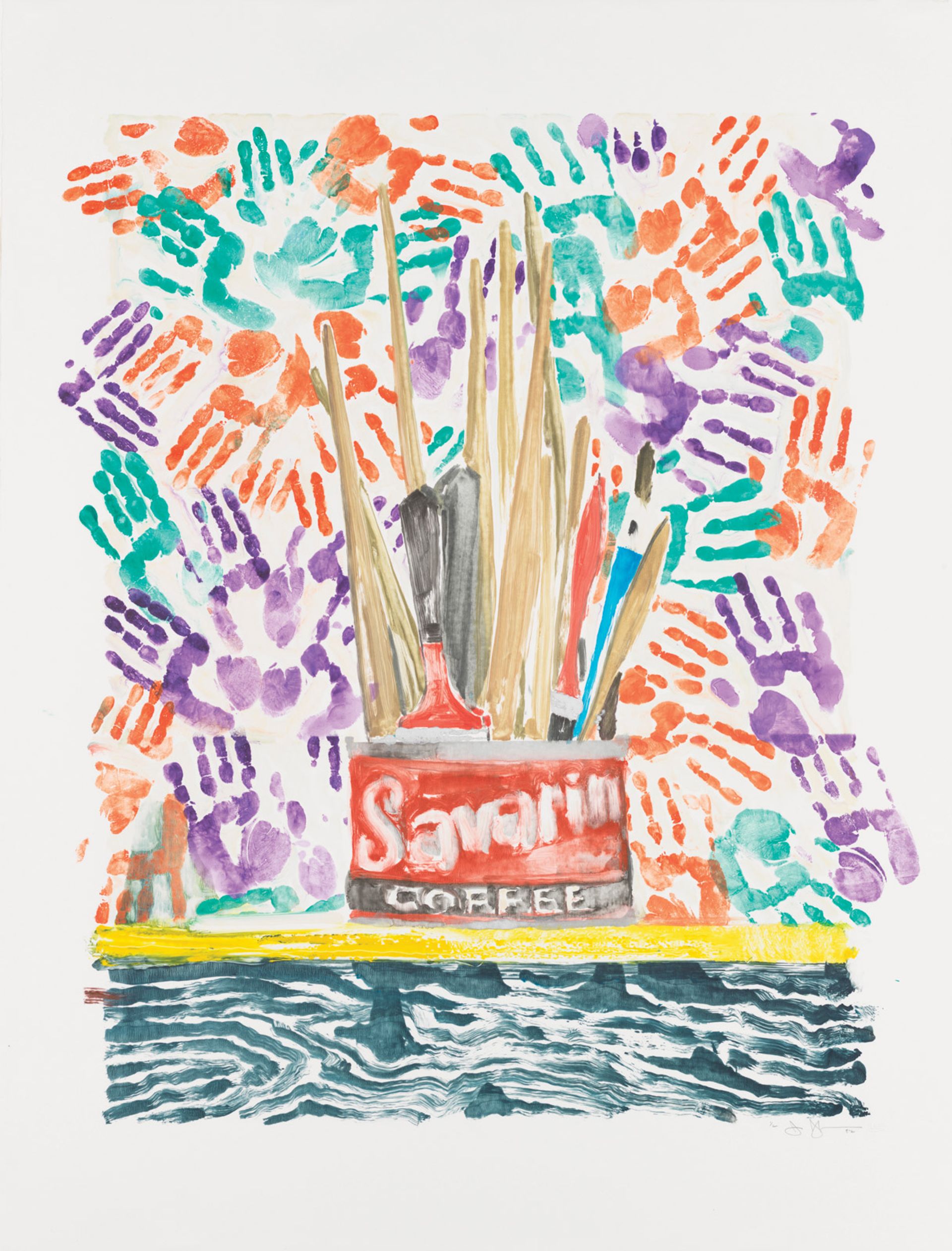 Johns often revisited a still-life motif in his so-called Savarin works, featuring paint brushes in a coffee can. And there is a ghostly echo of that image in an untitled 2010 drawing from his own collection, showing a vase on a pedestal, on public view for the first time at the Whitney.