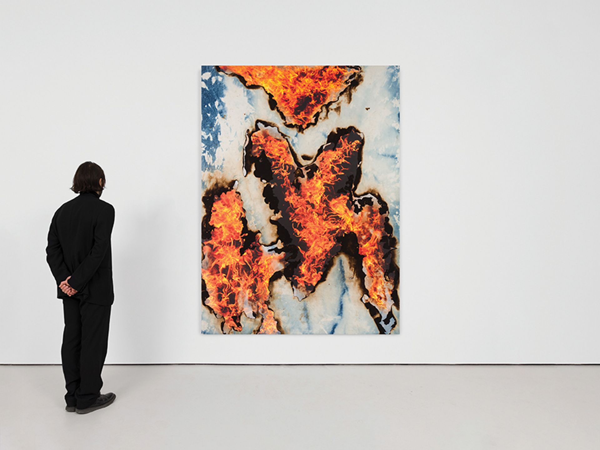 At Art Basel, your gallery is showing one of your new works—a continuation of your History Painting series—which incorporates patches of burnt tie-dyed denim with photographic renderings of the very flames that burnt the fabric. You use denim as a material a great deal in your work—what is its significance?