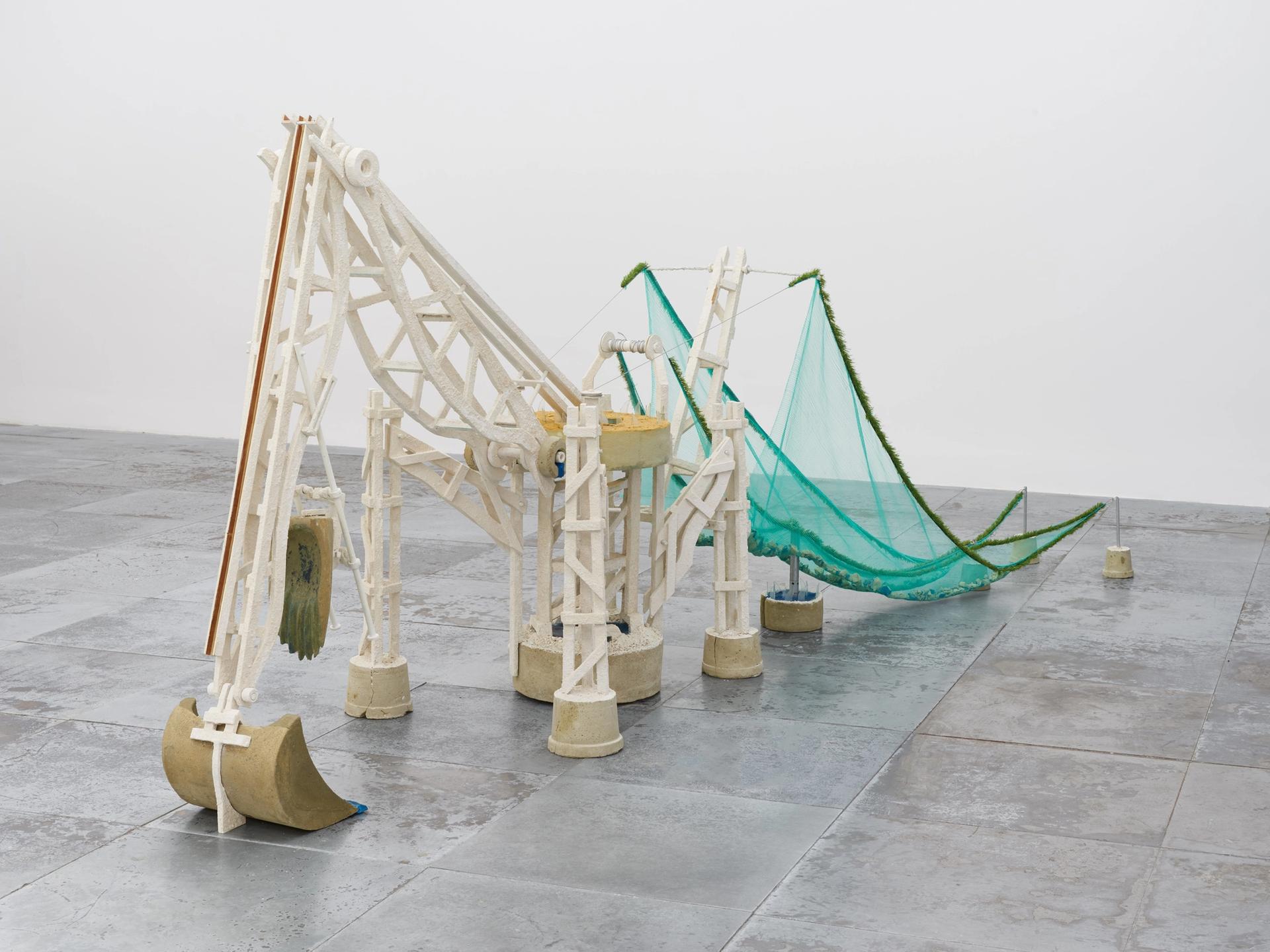 The largest work, Excavator White Cliffs (2021), recreates a digger in child size and with childlike imagination: constructed largely from chalk, it resembles a brontosaurus dinosaur, mixing the fantastical and absurd with the mundane and mechanical. Baker also draws our eye to the construction site's dangerous side: a winged hacksaw is adorned with jagged shards of glass, threatening to cut the viewer if they get too close. A wall mounted-plywood work resembling mountain peaks also mirrors the construction industry's conversion of the natural into the man-made. Throughout, Baker uses metaphor and association to subvert and reify the distinct qualities of these off-limits spaces, and in doing so draws our attention to processes that hide in plain sight throughout our urban centres.