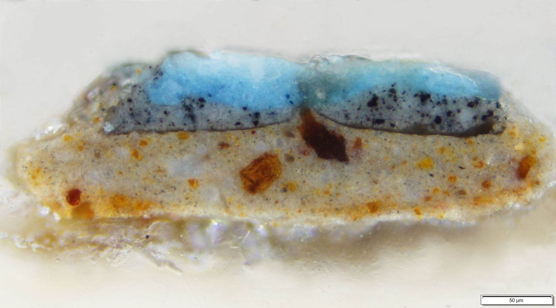 A cross section taken from the painting where analysis has identified the pigment Prussian Blue. Photo: Jessica David