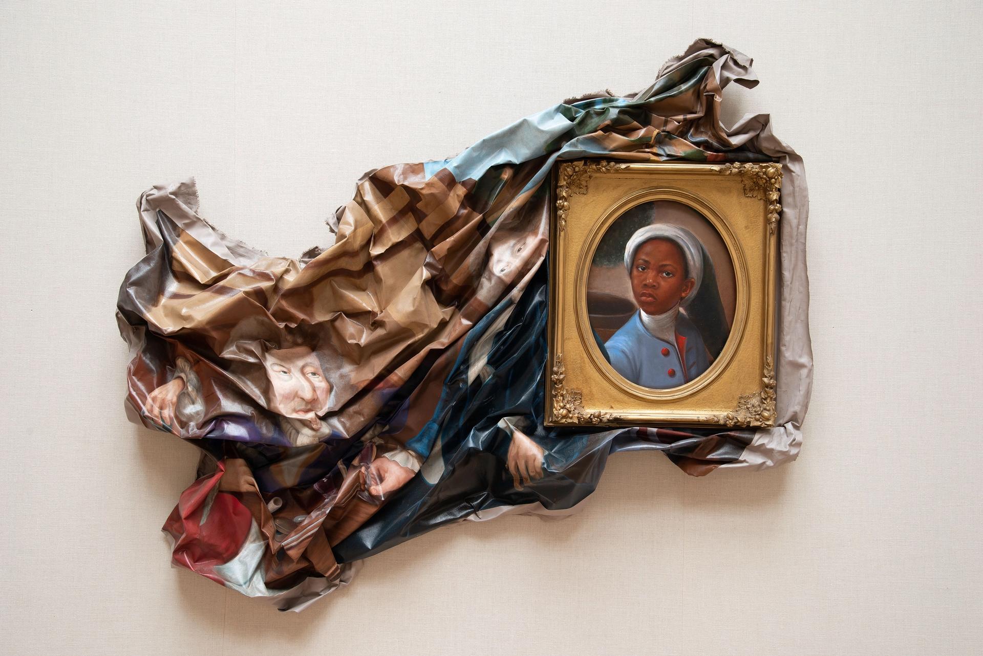 Kaphar’s riposte, a 2016 painting titled Enough About You, collapsed the four white men into a crumpled blur and transformed the boy into a defiant personality, rid of his collar, who stares out at the viewer from a gold frame. It remained on view at YCBA for six months. The artist has said he wanted to “imagine a life” for the child, with “desires, dreams, family, thoughts, hopes” that the original 18th-century artist—now thought to be a Dutchman active in Britain named John Verelst—was indifferent to. The work harnessed indignation over moral travesties past and present as well as glaring deficiencies in representations of people of colour today.