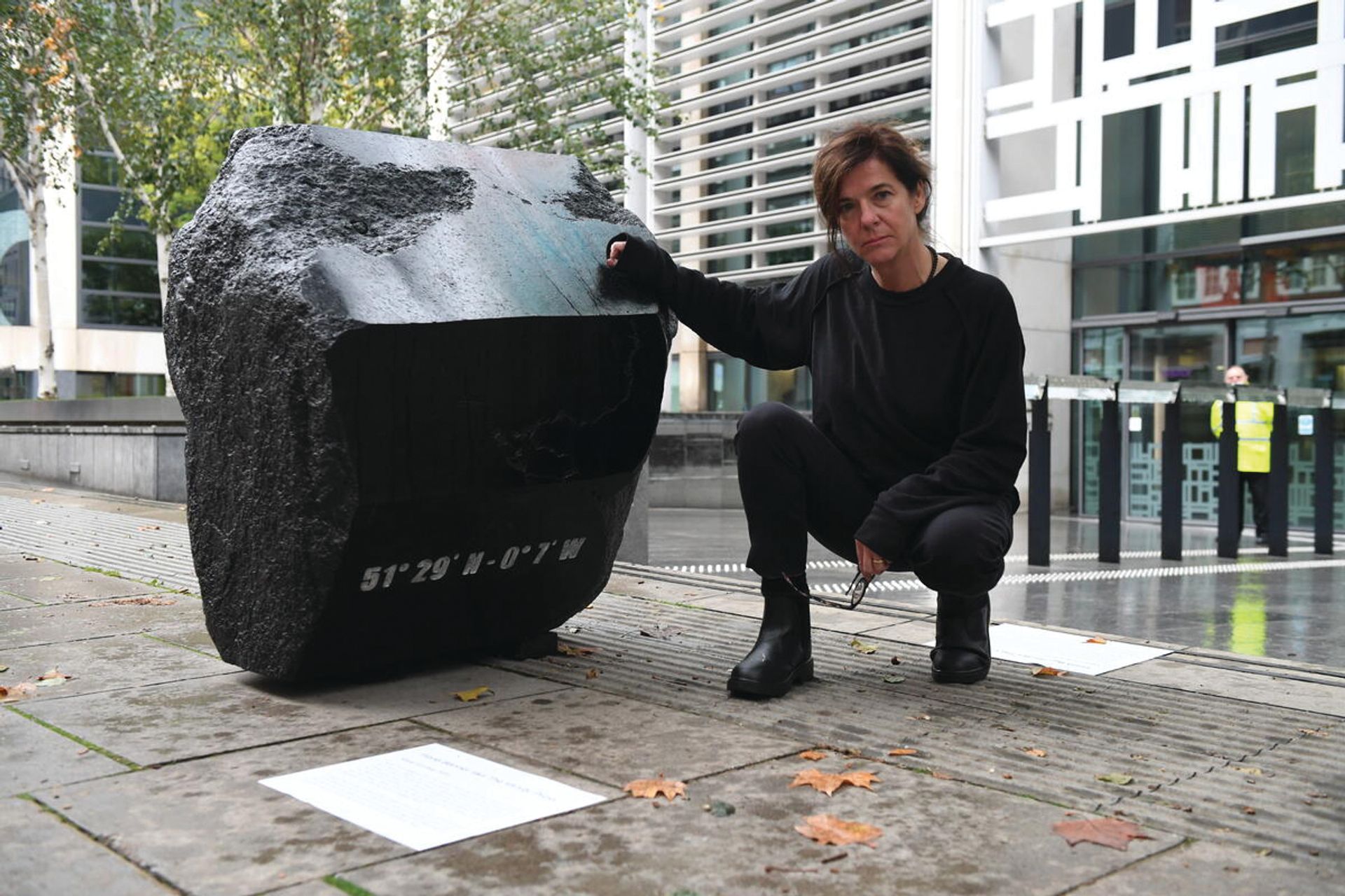 Working with Greenpeace, Fiona Banner delivered her granite sculpture, Full Stop Klang (2020), to Defra’s offices. Photo: © Chris J. Ratcliffe/Greenpeace