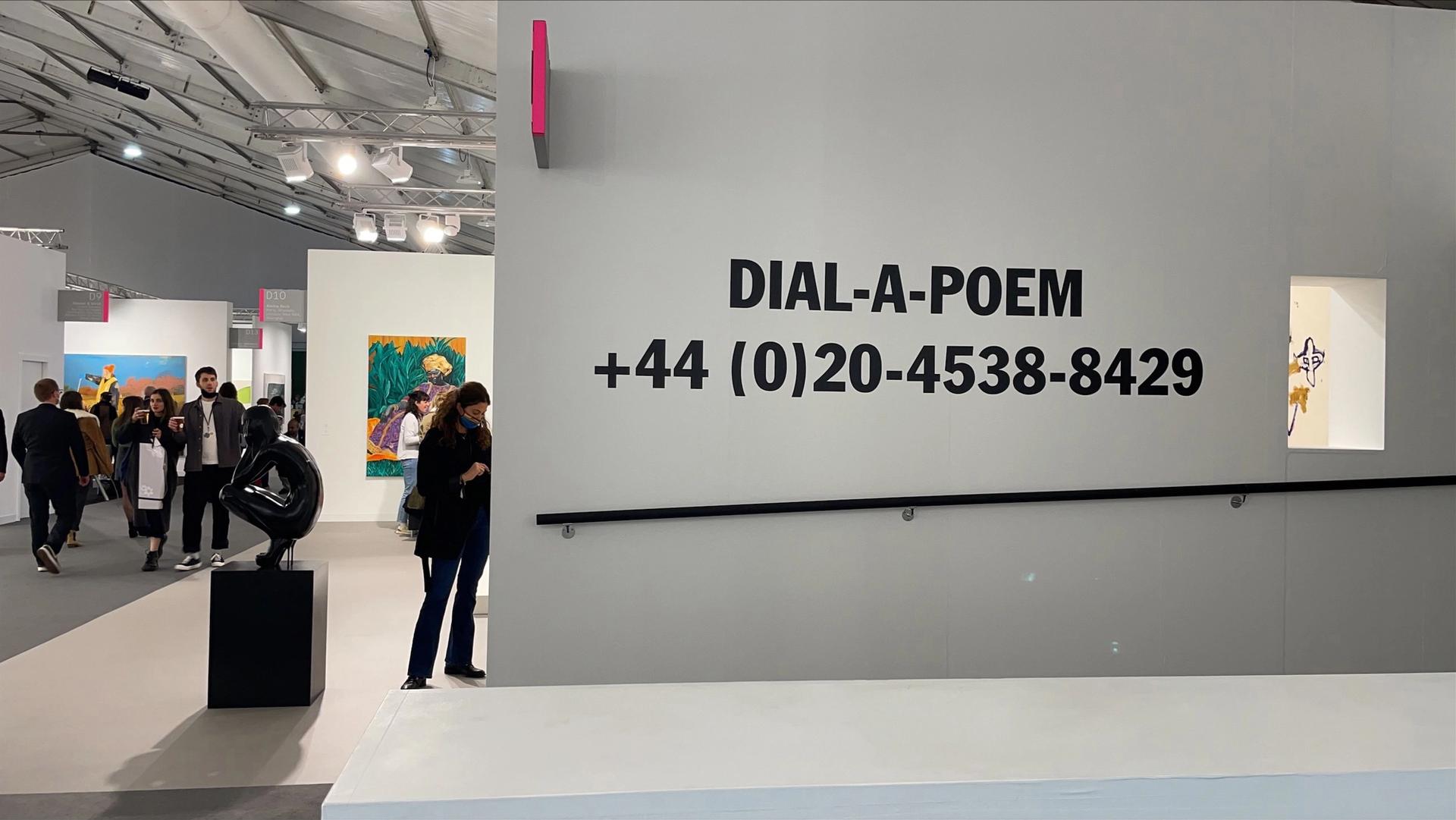 Feeling weary at Frieze? Why not pick up your phone and dial-a-poem, says Almine Rech gallery, which has the number for John Giorno’s impressive audio work emblazoned across its stand. One of the late US artist’s most important audio works, in the UK for the first time, gives callers a chance to hear recordings from an archive of poetry and political oration first produced in 1968. Visitors ringing the poetry hotline at the fair have been treated, for instance, to the veteran US poet Maureen Owen reading from her early collection Hearts in Space (1980): “I’m taking a ride with you in my head,” she says. Dial up and chill out.