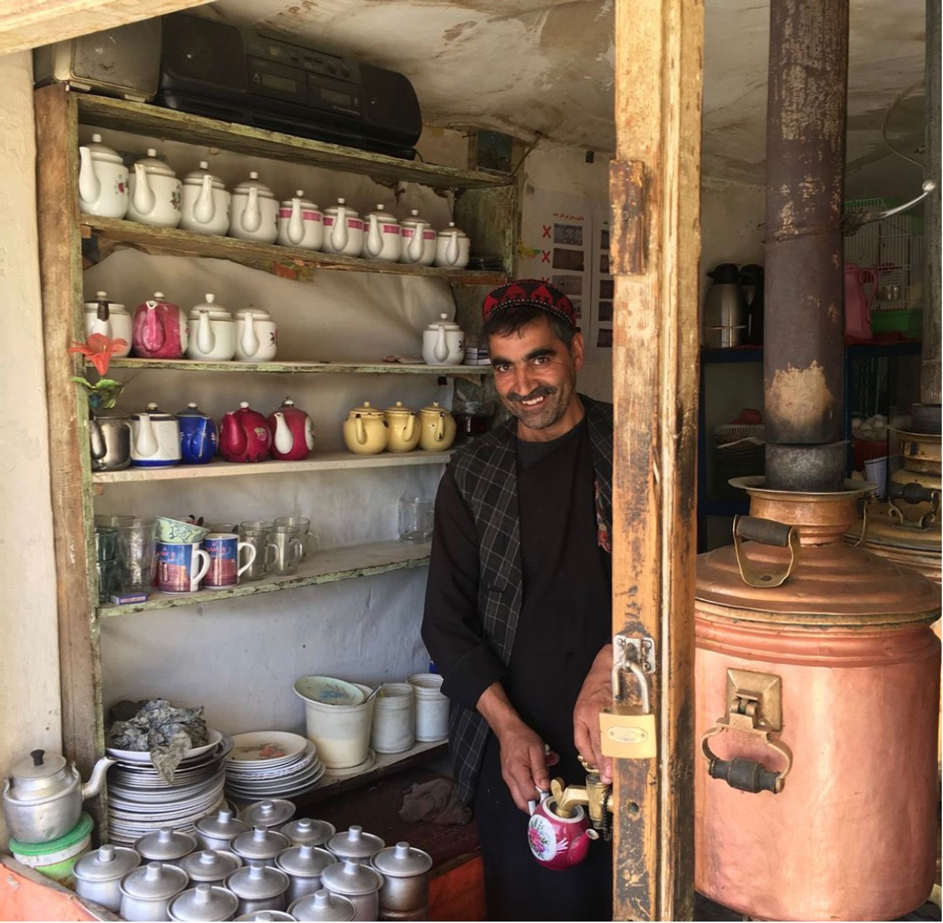 Gol Mohammad, a samovarchi and owner of a chaïkhana in Istalif, in 2017. On the shelves, he proudly displays his collection of repaired teapots. Photo: © Bastien Varoutsikos