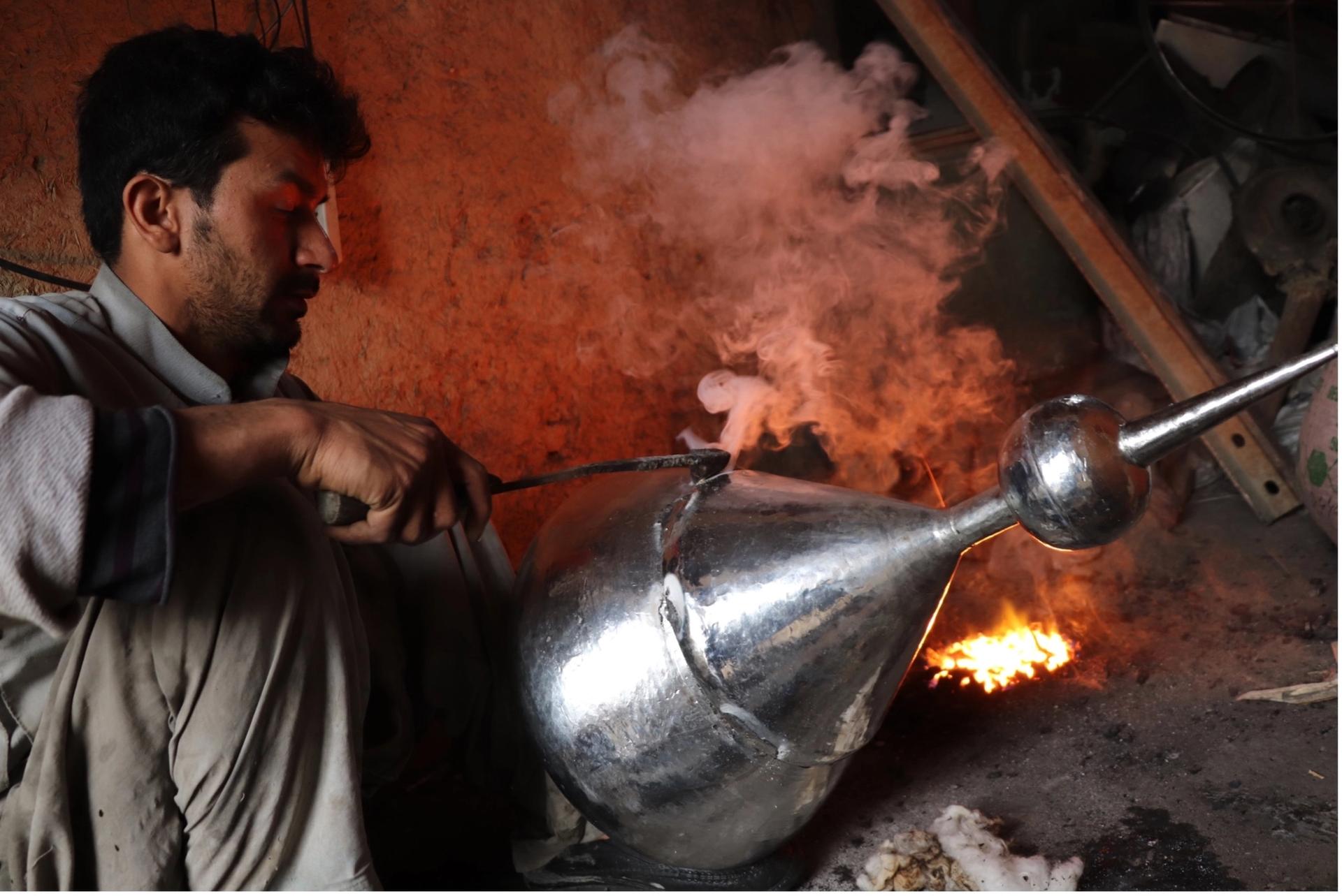 A mazari coppersmith in the middle of galvanizing a restored quba from the Hazrat Ali shrine, in Mazar-e Sharif, Afghanistan in 2018. Photo: © Bastien Varoutsikos