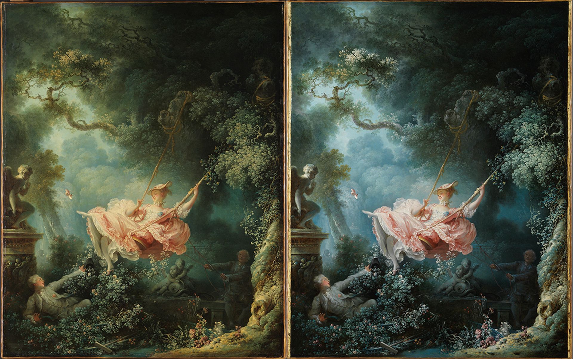 Jean-Honoré Fragonard, Les hasards heureux de l'escarpolette (The Swing, around 1767), before and after the restoration. © The Wallace Collection