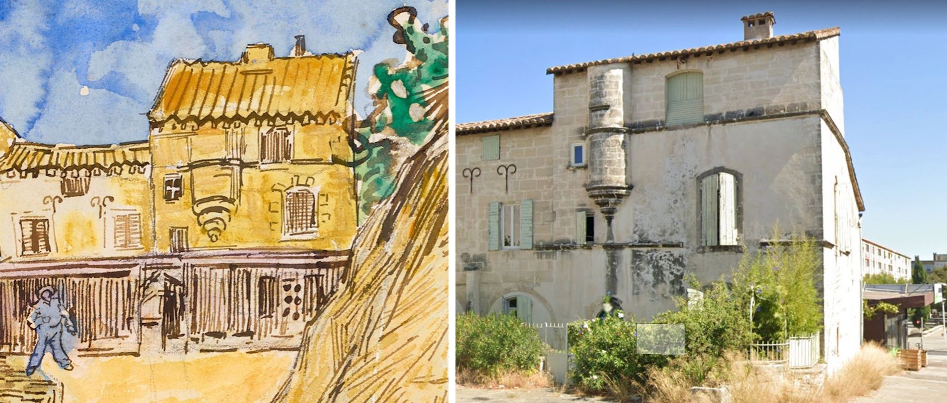 Most of the old farmhouse still survives in what is now the eastern suburbs of Arles (at 3 Rue Président J.F. Kennedy), marooned among nondescript 1960s apartment blocks. The left one of Van Gogh’s trio of linked buildings was sadly demolished around that time. But thanks to good fortune, the ancient farmhouse was not completely flattened in a decade when so much historic architecture was destroyed throughout Europe.