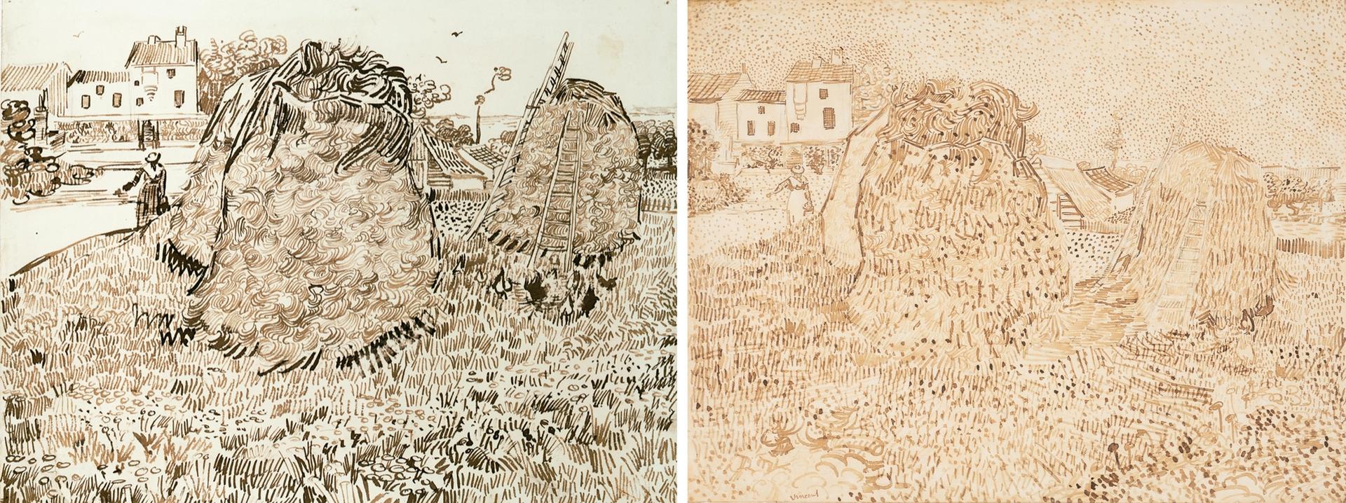 Van Gogh’s ink drawings: Wheatstacks in Provence, for Emile Bernard (July 1888), now in Budapest; and Wheatstacks in Provence, for John Russell (July 1888), now in Philadelphia. Courtesy of the Museum of Fine Arts, Budapest, and Philadelphia Museum of Art