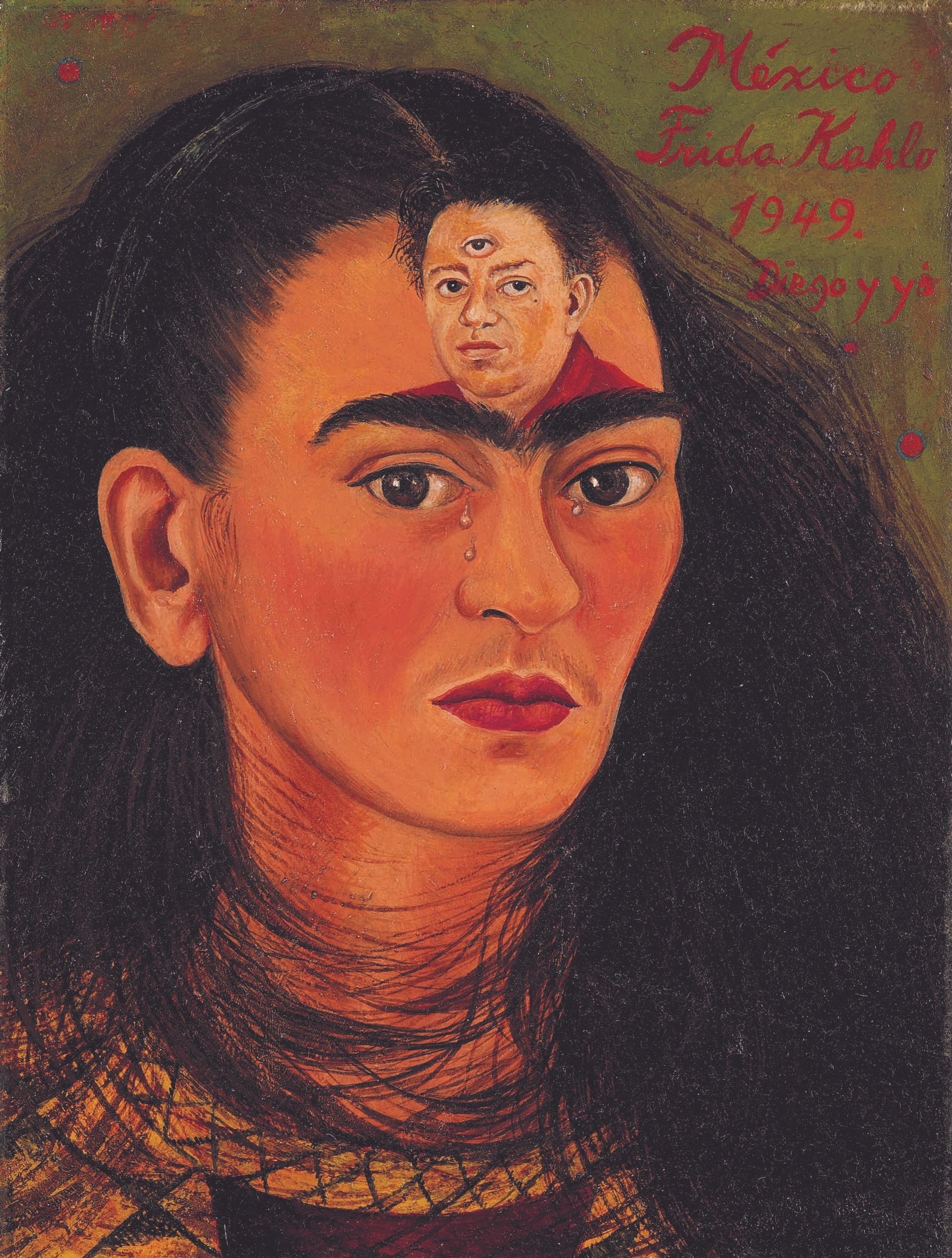 Three tears trickle down Kahlo’s cheeks, her hair hangs loose around her shoulders, while the image of her husband, the painter Diego Rivera, sits in the middle of her forehead.