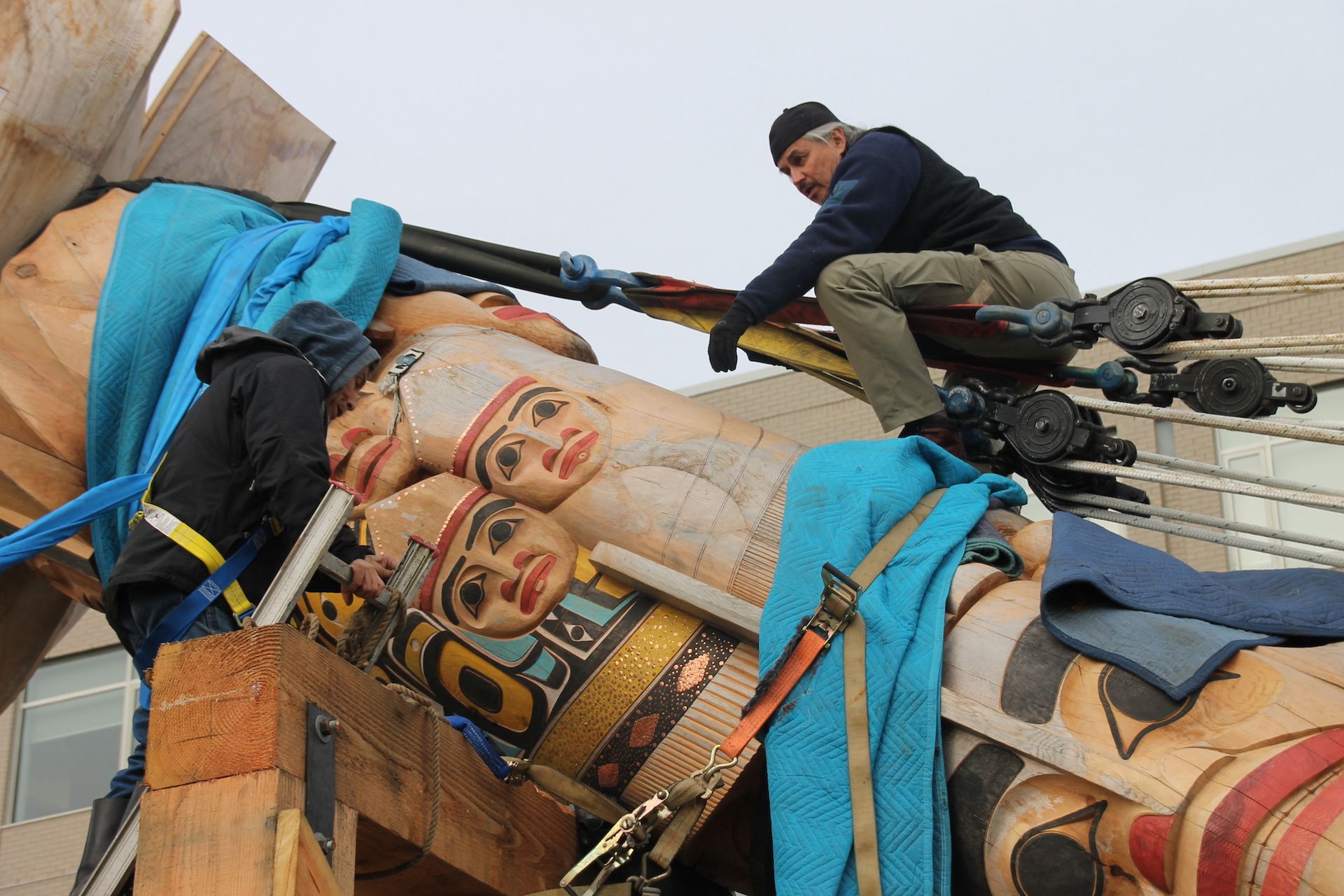 Haida chief and carver James Hart finishes his Reconciliation Pole at UBC in Vancouver on 31 March 2017. Photo by Hadani Ditmars