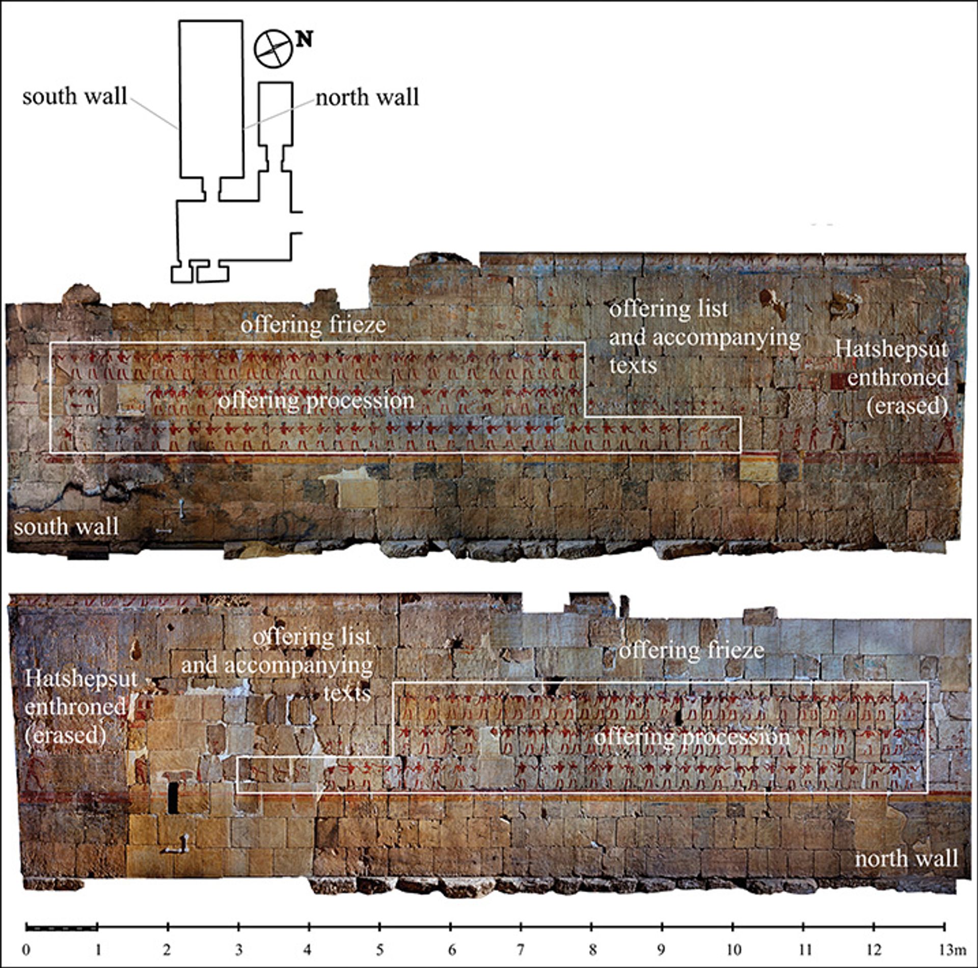 The reliefs cover the walls of a chapel within the mortuary temple of Hatshepsut—a female pharaoh who reigned from around 1473-1458 BC—and show a procession of 200 offering bearers, split over three registers across two walls. The temple stands on the west bank of the Nile at Luxor, close to the Valley of the Kings.
