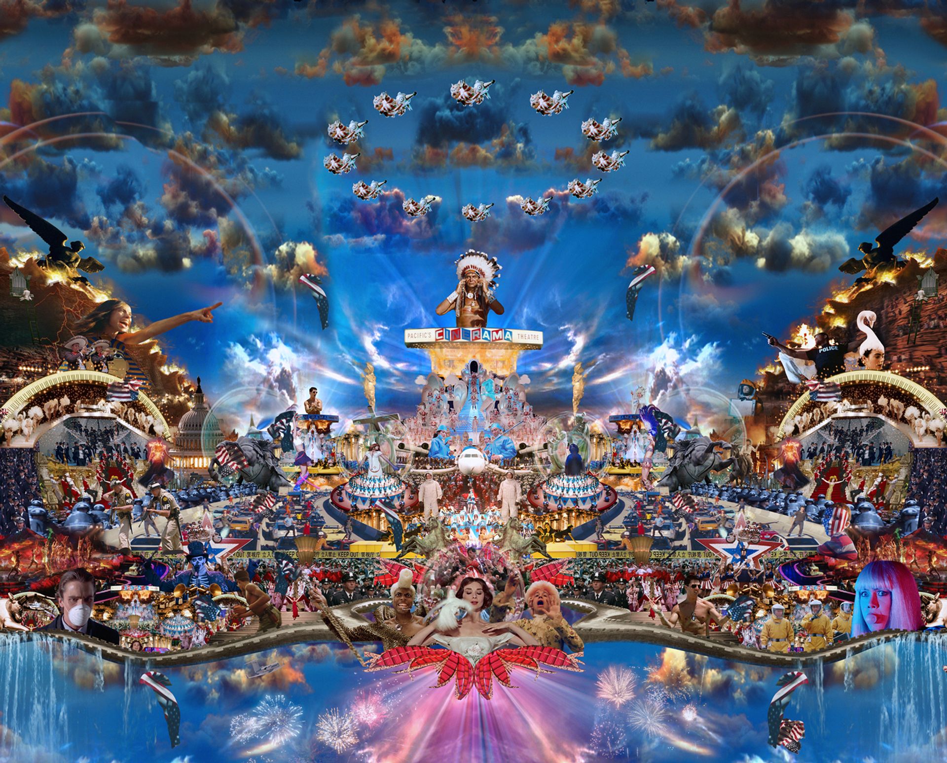 Eron Rauch: As the work is rooted in utilising tropes, archetypes, and clichés from Hollywood movies, it’s almost impossible not to just launch into a slurry of connections of maximalist US art and media. These include the layered combinations of Patrick Nagatani or Andrée Tracey; prestige TV openings; Daniel R. Small’s wry archaeology of the set of Cecil B De Mille's The Ten Commandments; “magic eye” books; California sci-fi cults; Broadway theatre set flats rotated by stagehands during musical numbers; and some manner of collision of 90s animated GIF-laden Tripod pages; and the panoramic fractalling of Jackson Pollock (dean of Modernist spectacle during the era of filmic material most used by Brambilla). The spectacle was certainly engaging (and I love maximalist art), but, like many works that re-present distilled spectacle, its irony never seemed to be able to provide enough power to create critical escape velocity from this even more weaponised spectacle.