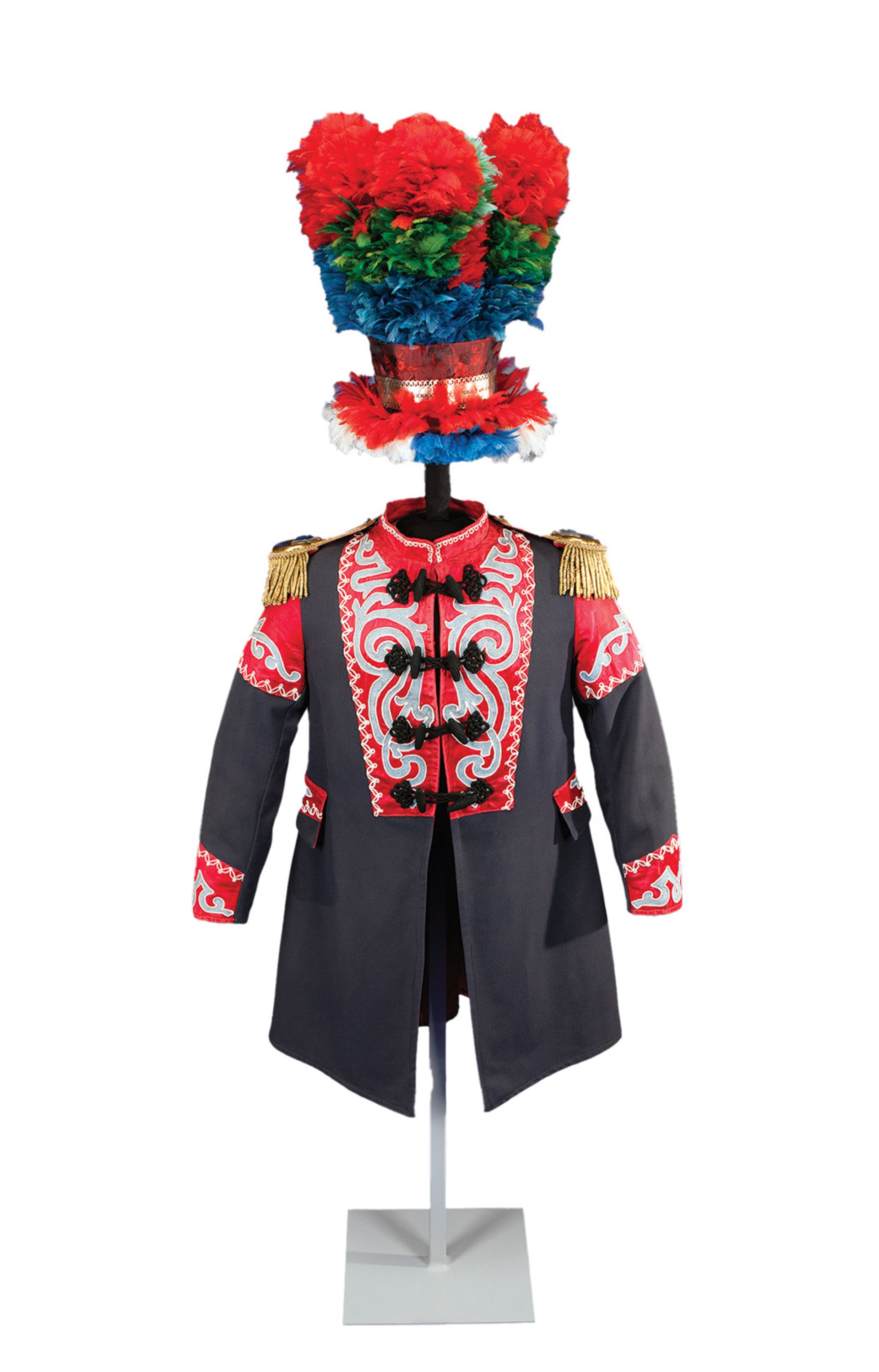 The Osage (Wazhazhe) people called this land of the rivers home. When the US military arrived there around 1800, they presented uniforms as diplomatic gifts, which became symbols of status adopted by the native women as bridal dress. After Missouri achieved statehood, thousands of their tribe were forcibly relocated via the Trail of Tears to reservations in Oklahoma, where they lacked access to familiar materials. Determined to maintain traditions, unidentified Osage women created Wedding Coat and Plumed Hat by fashioning a Western-style coat and embellishing it with ribbon, horsehair and feather, an assertion of female identity and resistance. To quote the authors: “The garment, fully folded into Osage culture and aesthetics and typically passed down to the family’s next generation, perpetuated associations of status that Osage people forged during the previous centuries in Missouri.”