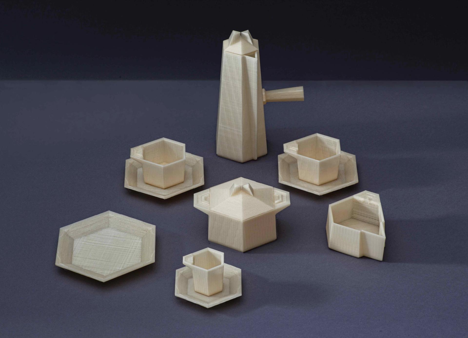 The strong geometric lines characteristic of architect Frank Lloyd Wright can be seen in his design for a coffee set that was made by Bas van Beek in 2007 Courtesy the artist, The Wolfsonian–FIU