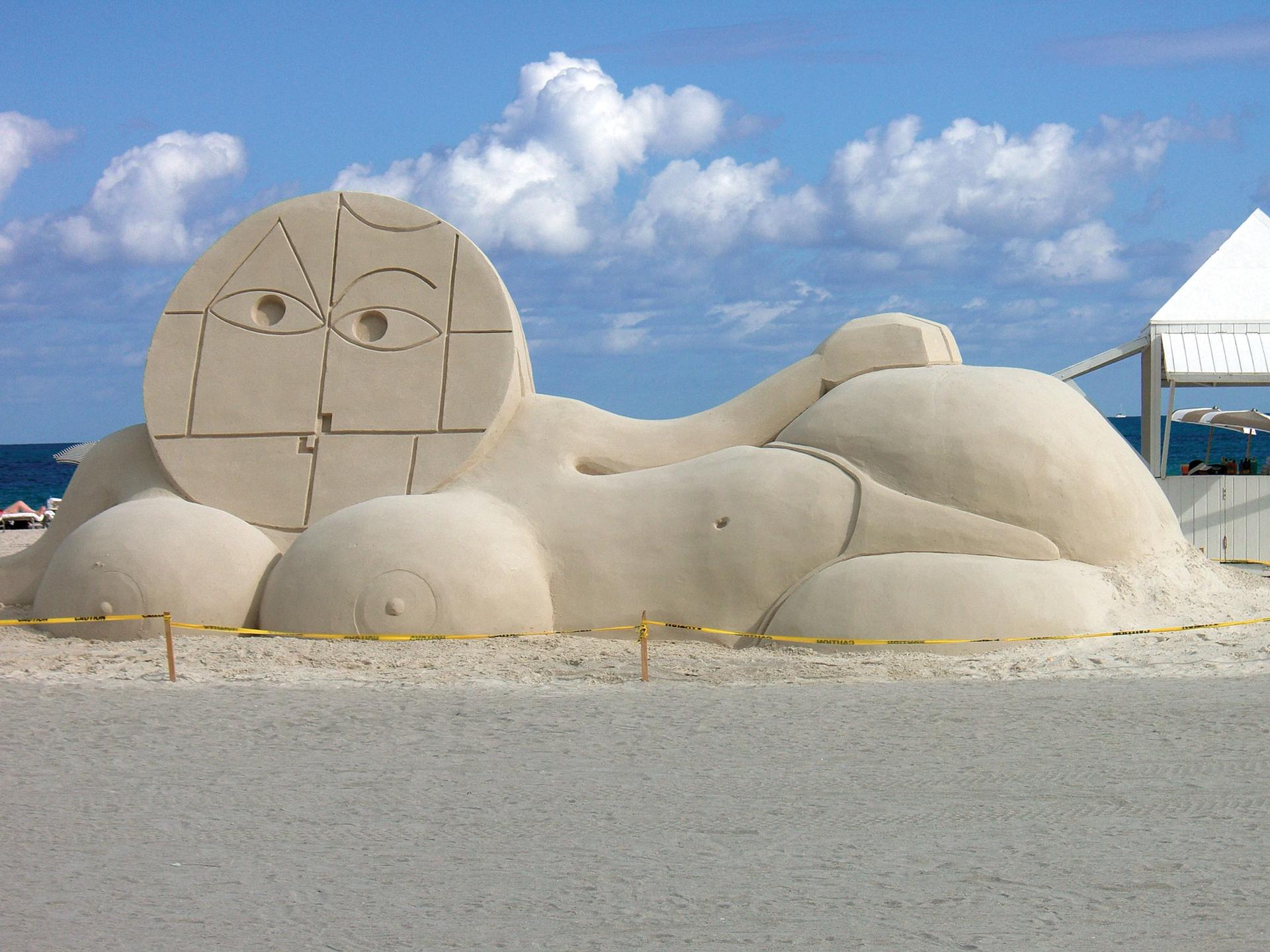 In the sand behind the Sagamore Hotel in Miami. In 2007 we invited Spencer Tunick for one of his well-known nude photo shoots. He photographed 800 naked volunteers in the pool, the beach and the balconies of the hotel. In 2008 Olaf Breuning created his Sand Sphinx, an abstracted 150-ton sphinx-like sand sculpture of a reclining woman. We also featured Will Ryman and his Rose on 65th Street installation in 2011.