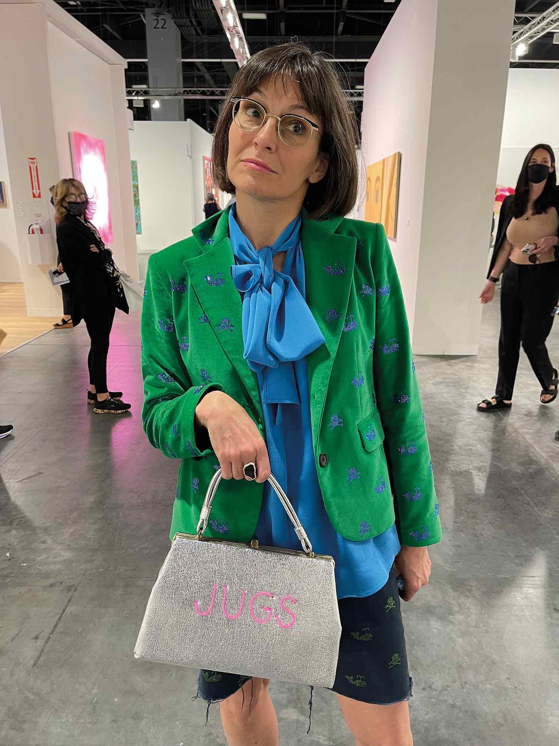 The effervescent author and art scholar Sarah Thornton was seen zipping through the aisles of Art Basel in Miami Beach this week in a fetching green blazer and jaunty blue shorts. Thornton is currently penning a book called Uplifting Sagas: the Top Half of Women’s Liberation, which “explores the universal truths of mammary glands”, among other things. This explains why the words “bosom” and “jugs” were emblazoned across Thornton’s jaunty silver bag designed by the Swedish American artist Michele Pred. Most words for breasts are demeaning, says Thornton, but “‘jugs’ acknowledges milk provision while using the word ‘bosom’ is about making an unsexy word sexy.”