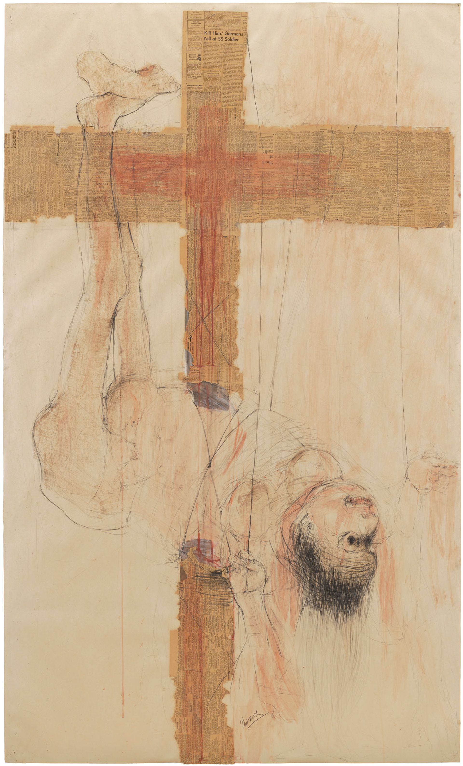 Lasansky sketched staccato, serrated lines in a limited palette of black, white, and red, offset by yellowing pages of collaged newspaper clippings. He handled the large sheets of paper brutally, ripping and lining them with pinholes. Once completed, he numbered these monumental works on paper instead of titling them. The overall name of the series, however, was intended to express universality and refer to all victims of the Nazis.