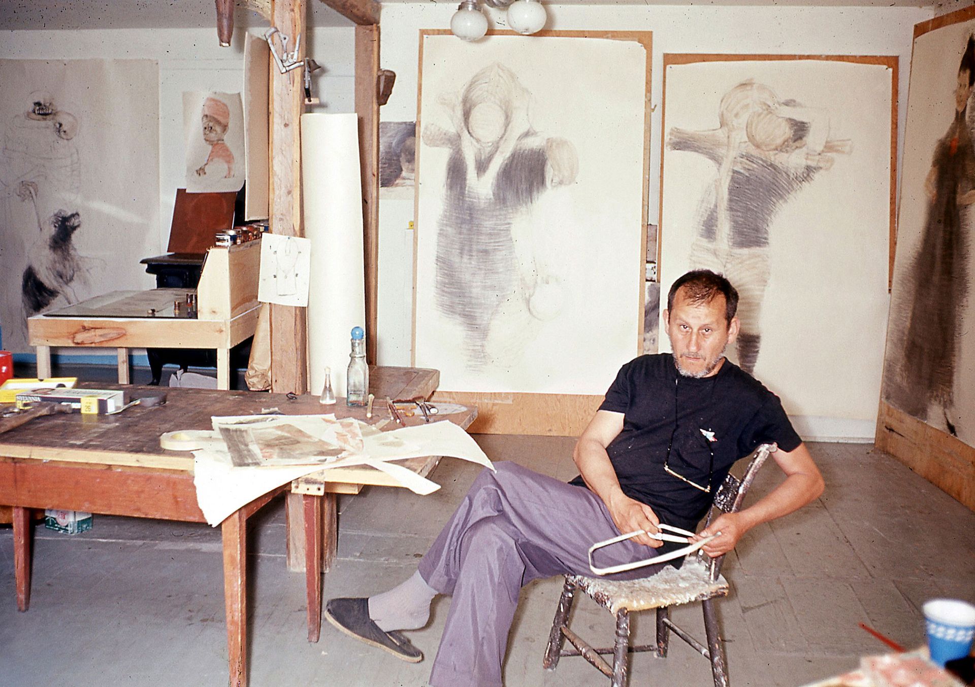 Mauricio Lasansky working on “The Nazi Drawings” in his studio in 1962, Vinalhaven, Maine Photo courtesy the Lasansky Corporation