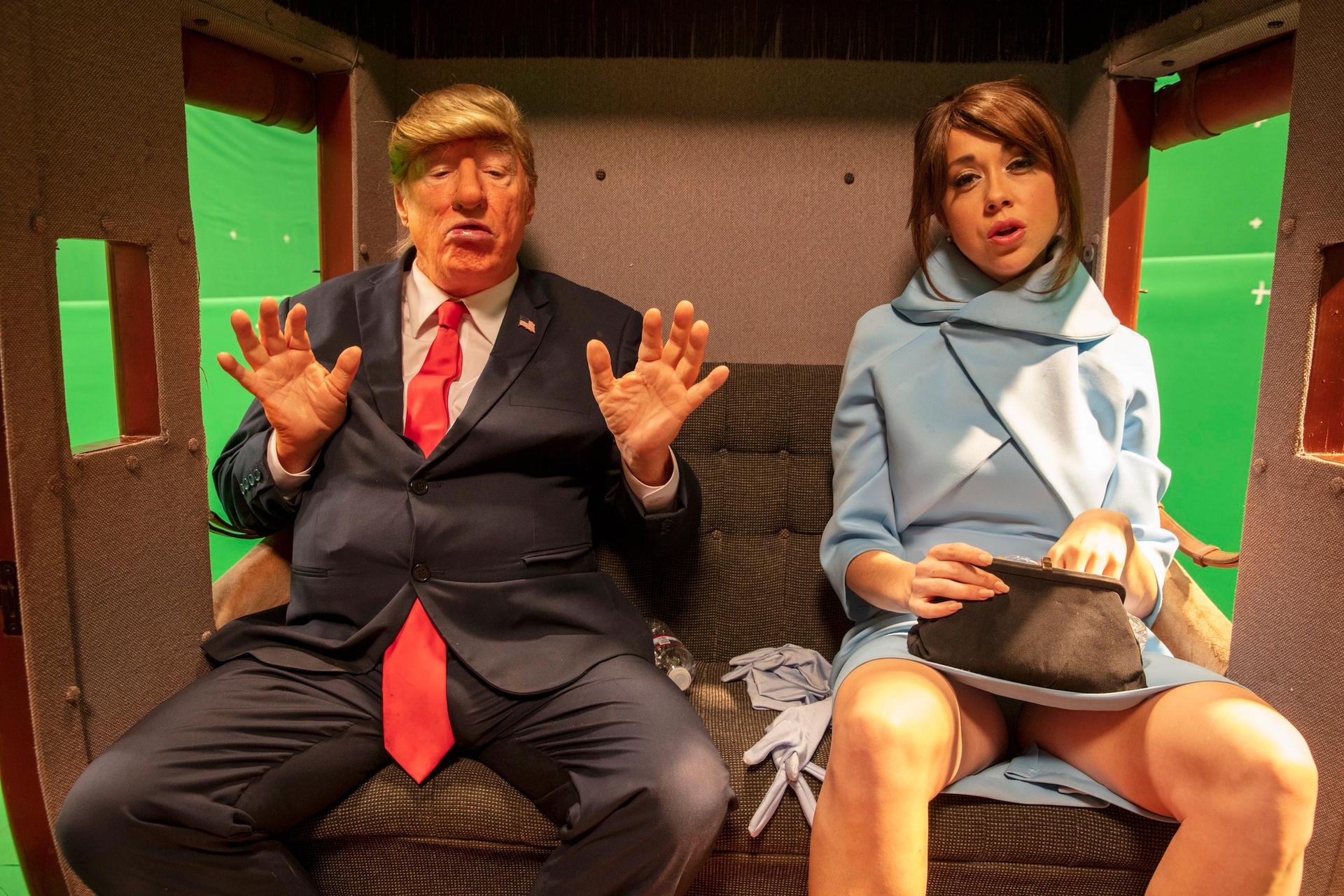 The blurring of reality and fiction is also present in the new, four-channel immersive film installation DADDA (2021) by McCarthy, in which actors playing Donald Trump and other famous Americans, including his wife Melania, Andy Warhol and Nancy Reagan, take a journey on a stagecoach, culminating in a bloody finale.