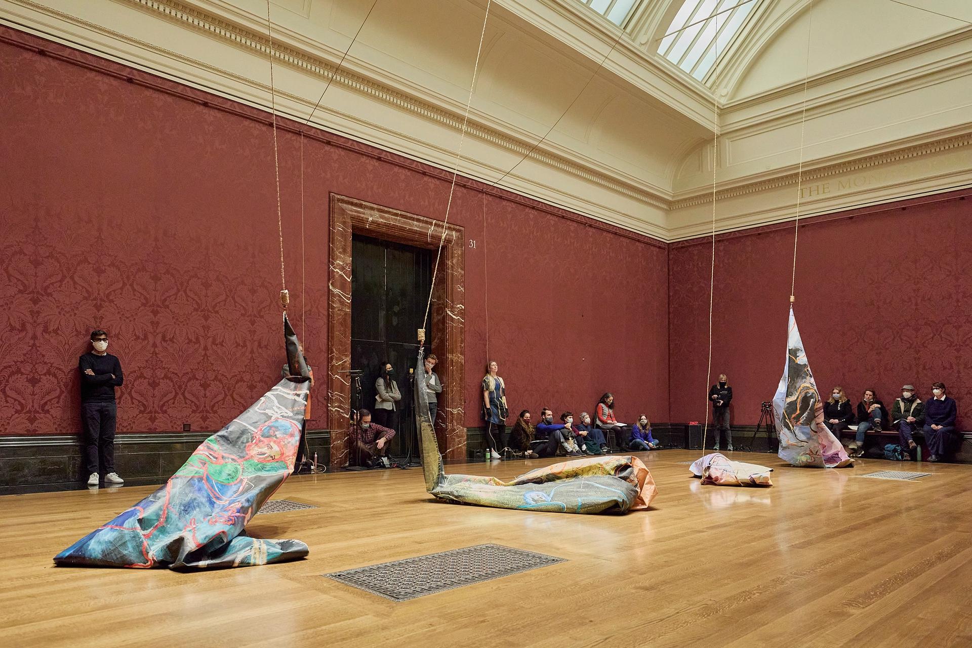 It was therefore an utter joy to see these vexed issues getting a robustly irreverent seeing-to in Florence Peake’s Factual Actual (2021), a live work which involved striking and unexpected physical encounters between paintings, performers, and audience members. This multilayered performance took place upstairs from the Poussin show, in a gallery that, deliciously, was directly adjacent to Velazquez’s Rokeby Venus (1647-1651). Here five dancers interacted with four giant vivid canvases painted by Peake, which were first suspended from the ceiling before being winched down to the floor to be dragged, crumpled, propped and used to cover, hide and house the performers.