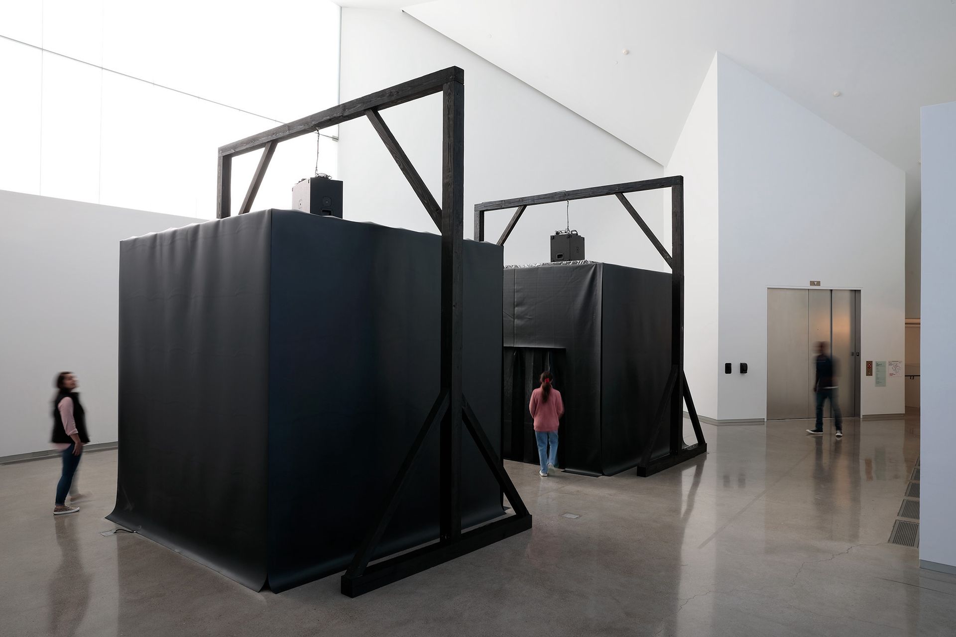 Set it Off by New York-based composer and multidisciplinary artist Jeremy Toussaint-Baptiste is an immersive sound exhibition that uses frequencies that register just below human audibility. The exhibition, which is split between the ICA (until 19 June) and the nearby 1708 Gallery (until 12 June), continues Toussaint-Baptiste’s research into what he calls “hyper-audible” object environments, using a car’s audio system as the most recognisable transmitter of bass. He composes his work like a musical arrangement to analyse how bass affects cities and their residents. The artist works in a black minimal aesthetic intended to symbolise the shared Black experience, creating bass frequencies and vibrations that function as sonic representations of Minimalism. Set it Off features a new iteration of his work Get Low, which references Kazimir Malevich’s 1915 painting Black Square.